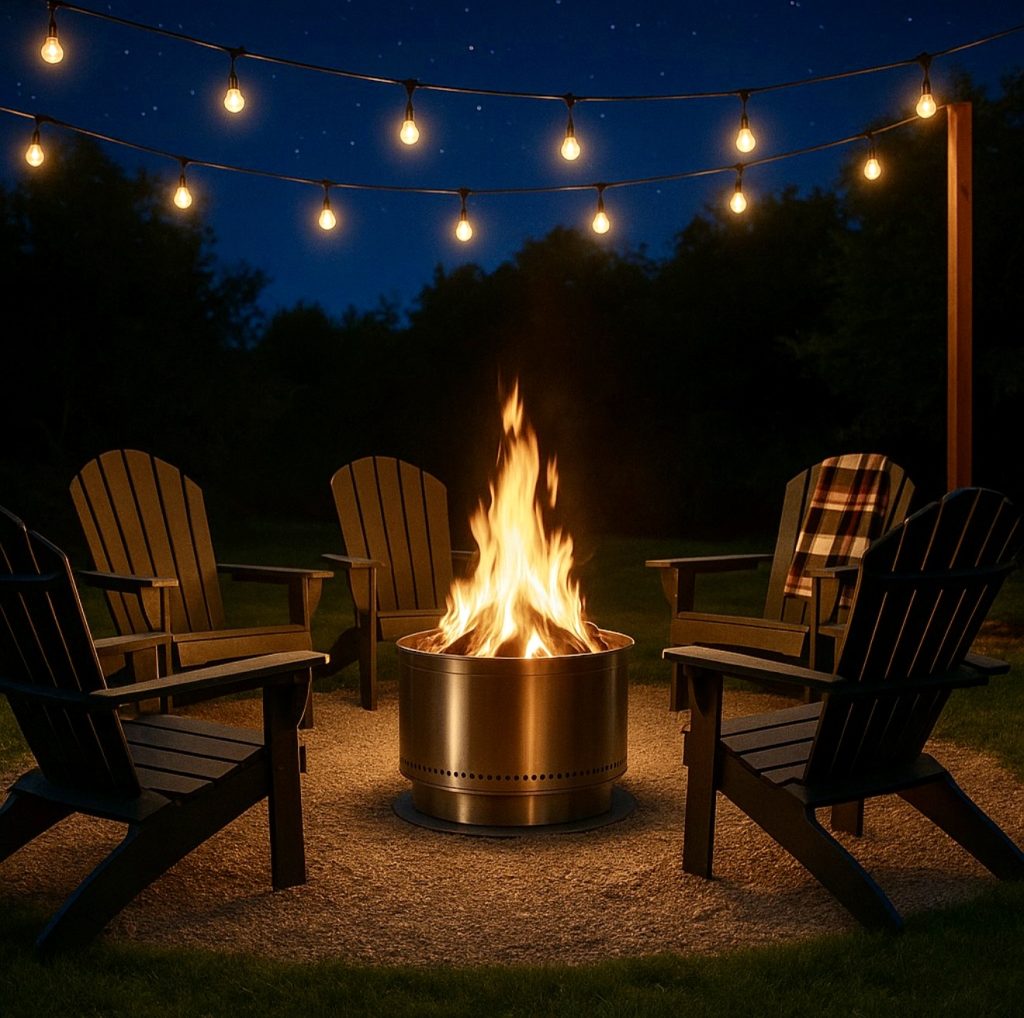 This is the backyard moment everyone wants in 2026: a classic gathering circle illuminated by soft café lights and a sleek smokeless Solo Stove fire pit. It’s the simplest way to add style and atmosphere without complicated construction. Adirondack chairs offer relaxed seating, and the neutral gravel base works well even in a small space. What homeowners love about a Solo Stove style is the clean burn—no wind-blown sparks, no smoky smell following you inside. It’s the perfect example of an easy, low-effort idea that looks high-end even when you’re working on a budget.