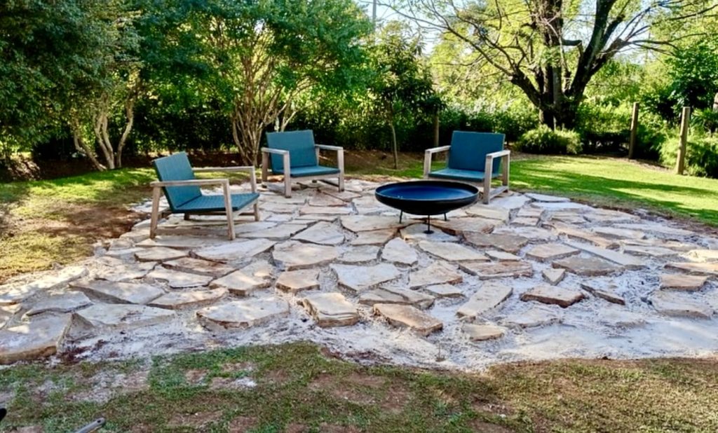 This design uses irregular flagstone to create a free-form fire pit zone that blends naturally into the yard—a great alternative to traditional brick pavers or poured concrete. The style is laid-back and organic, and it’s ideal for anyone who wants a backyard feature that looks like part of the landscape instead of something added on top. The circular lounge chairs offer a modern twist, while the portable pit keeps things flexible and in-ground optional. If you love the idea of an easy and natural-feeling design, this is a smart direction that works beautifully with DIY projects and cheap, easy installs.