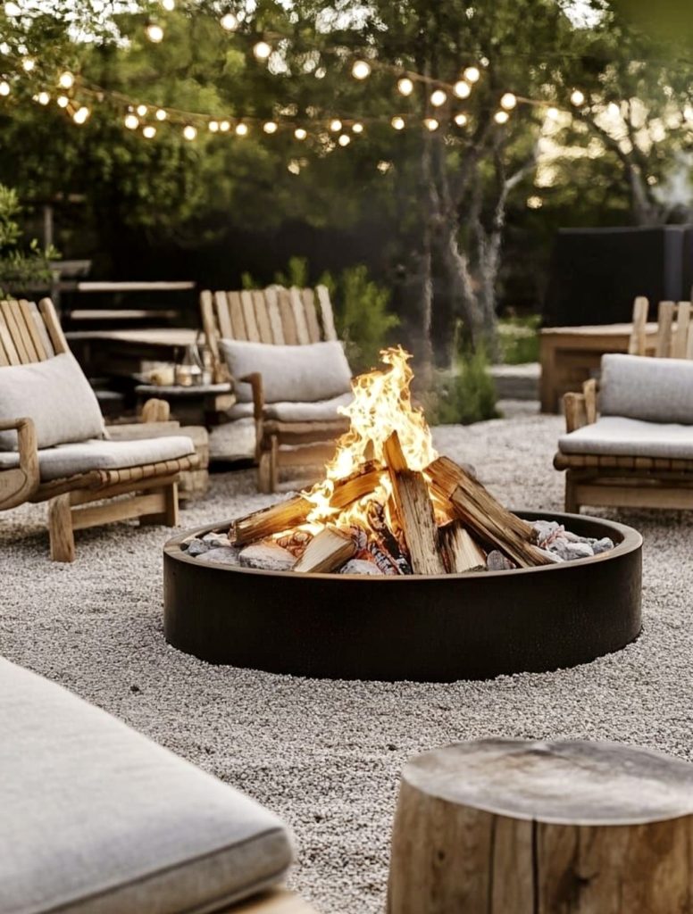 7. Rustic Wood-Look Seating Around a Deep Steel Fire Pit
