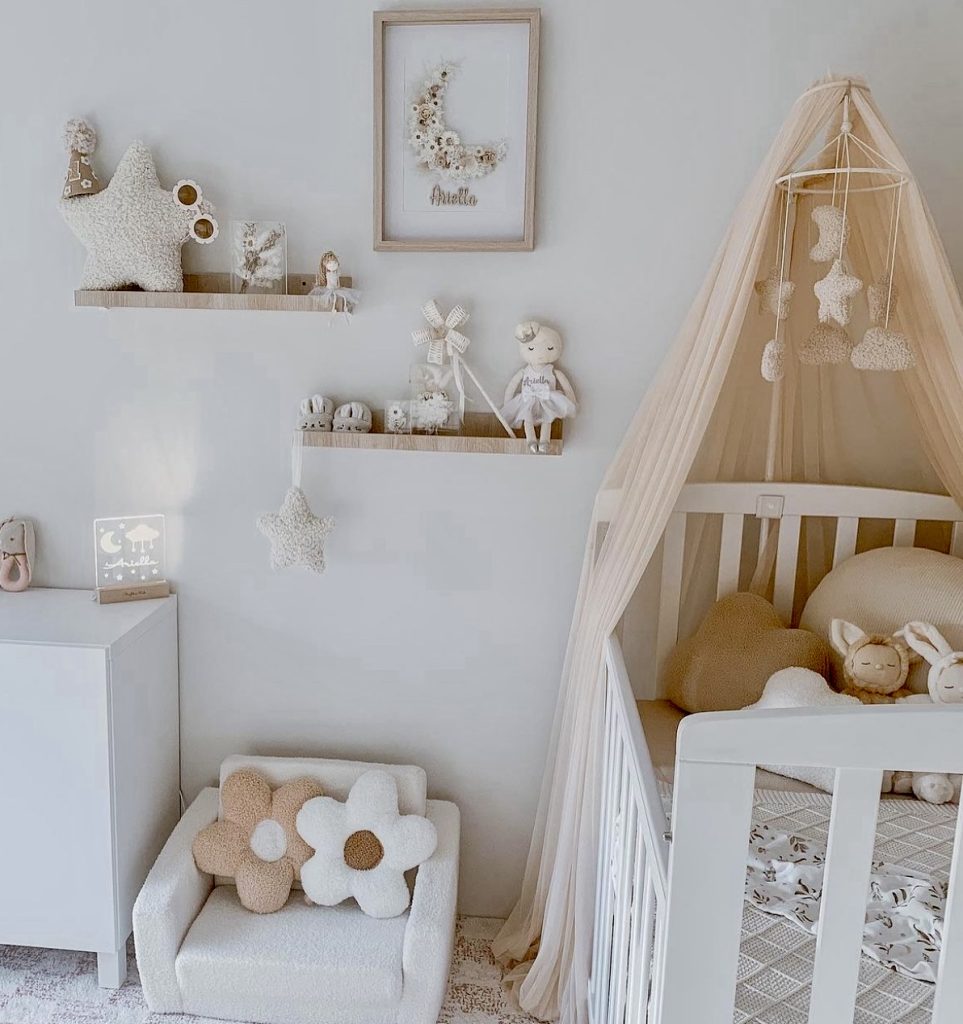 This dreamy nursery embraces the beauty of simplicity with creamy neutrals and tactile details. The delicate canopy over the crib adds a soft, boho charm, while plush toys and knitted textures make the space feel soothing and safe. Subtle star motifs and delicate handmade decor create a whimsical yet modern atmosphere perfect for a small room. Every element—from the warm lighting to the cozy floral-inspired pillows—brings a tender, nurturing energy. It’s a serene haven that feels both stylish and comforting, ideal for modern parents who love understated beauty.