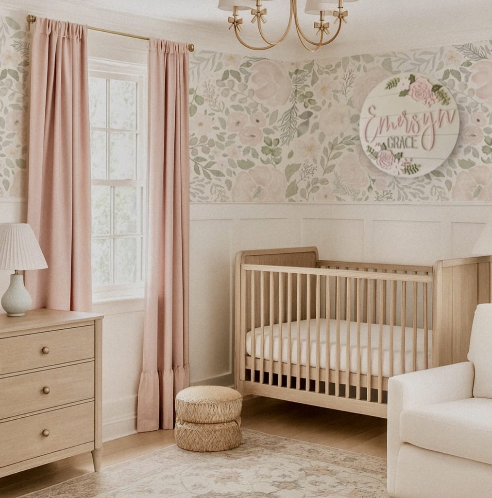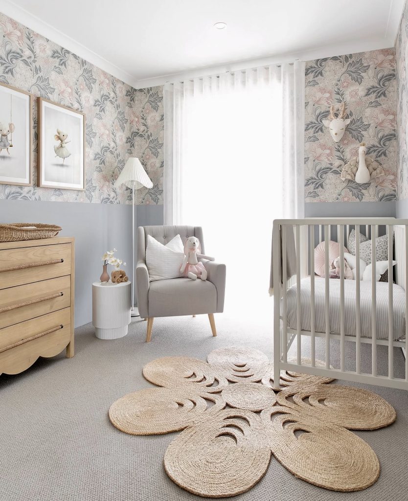This nursery combines floral charm with modern design, creating a space that feels both classic and fresh. The delicate wallpaper brings together blush and green hues, adding depth and natural energy to the room. Paired with neutral furniture and sculptural decor, it’s a perfect blend of vintage inspiration and current 2026 trends. The boho jute rug ties the look together, grounding the light and airy palette. Every element whispers sophistication while keeping the atmosphere joyful and tender.