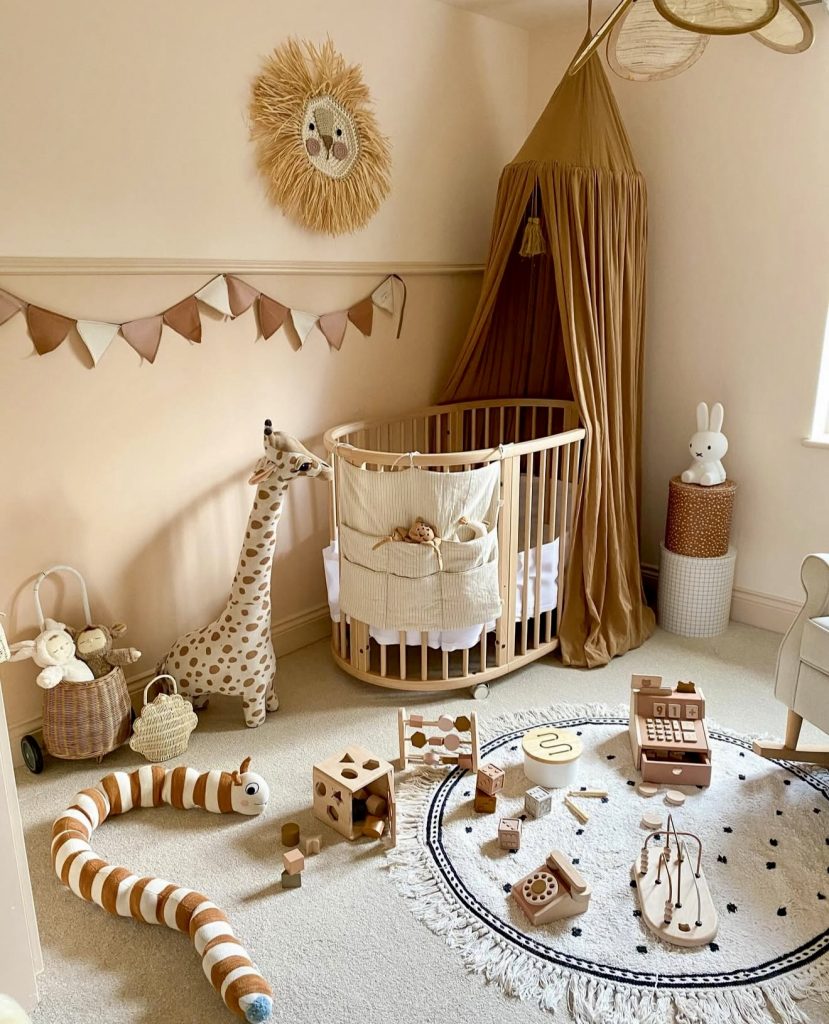 This cozy nursery captures the essence of boho adventure with its earthy tones and natural textures. A soft lion wall hanging and rattan canopy add character and warmth, while wooden toys create a grounded, sensory-rich play area. The mix of camel and cream hues makes the room feel inviting and gender-neutral, perfect for parents seeking a not-pink approach. Despite being a small room, the thoughtful layout ensures plenty of open space for play. Every element—from the woven baskets to the cheerful bunting—tells a story of nature and imagination.