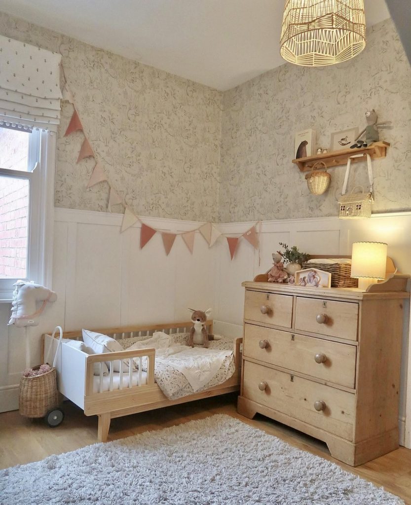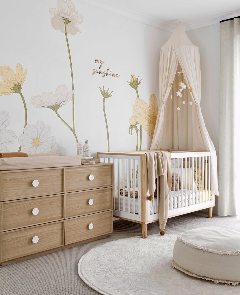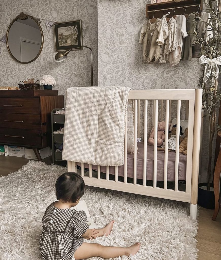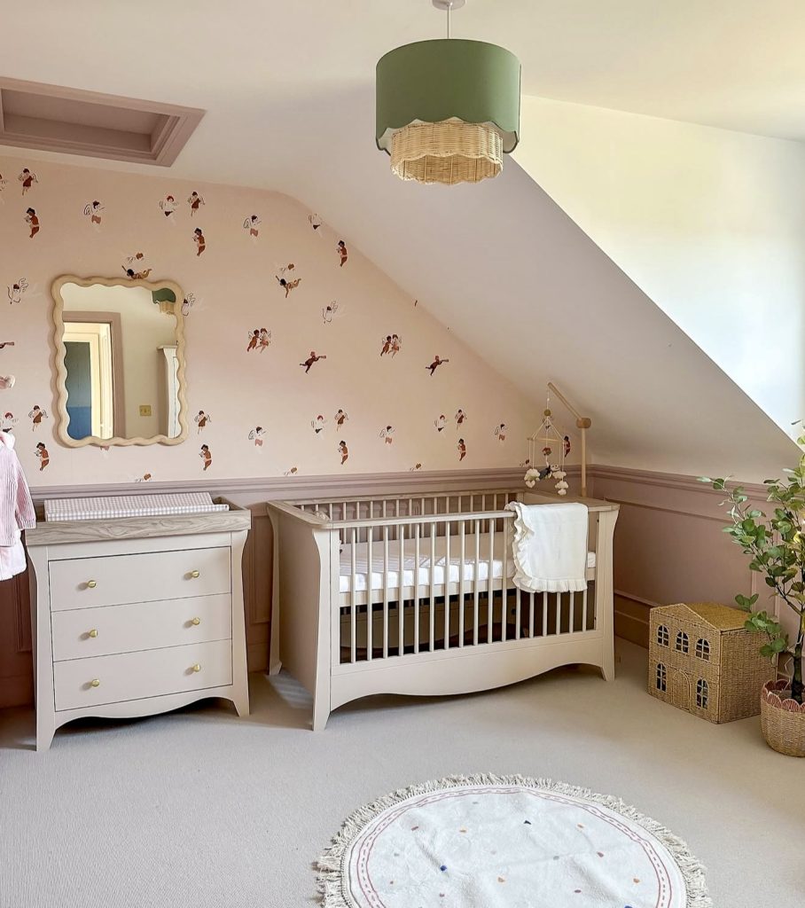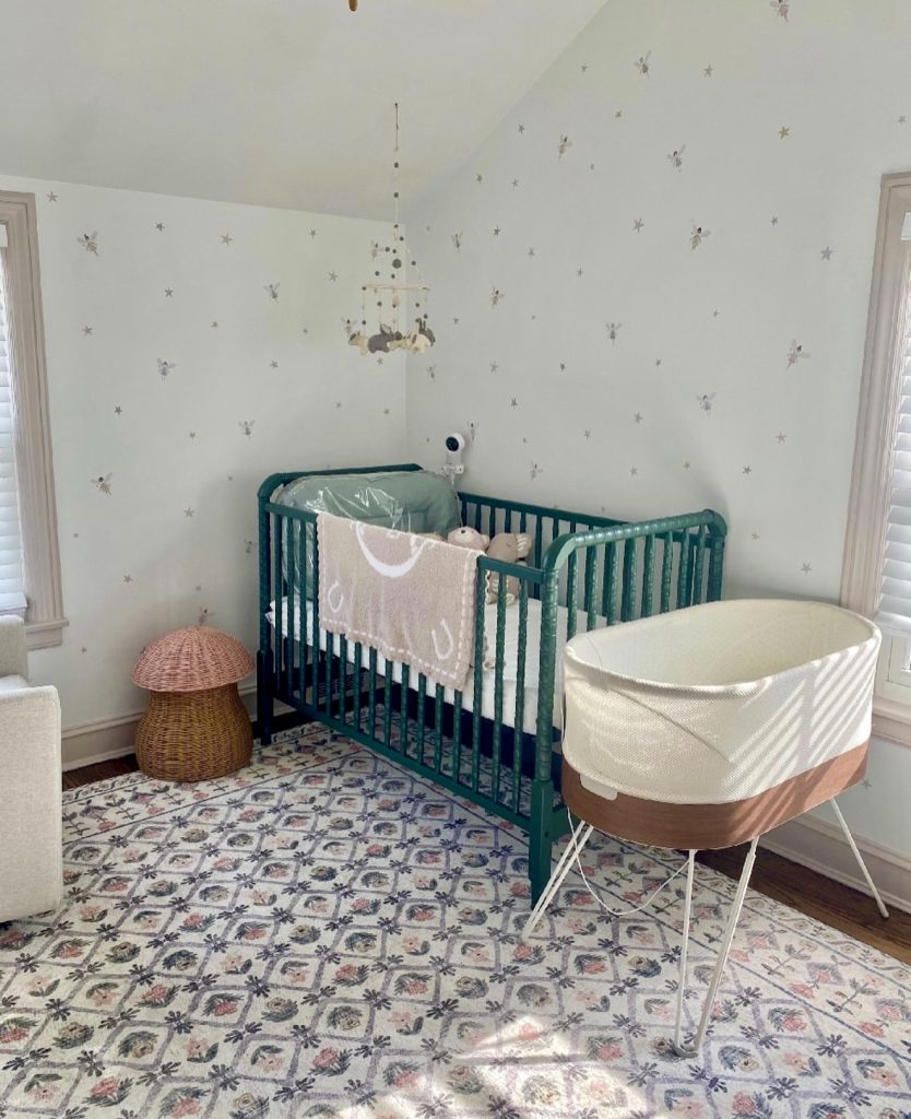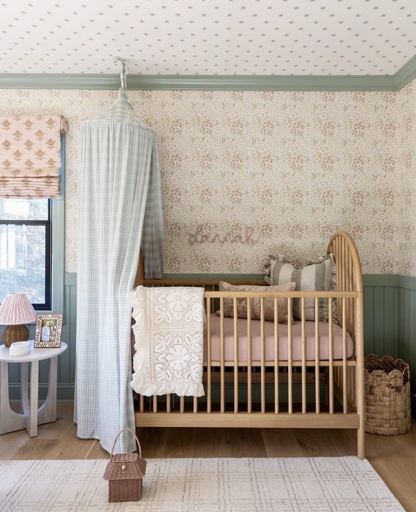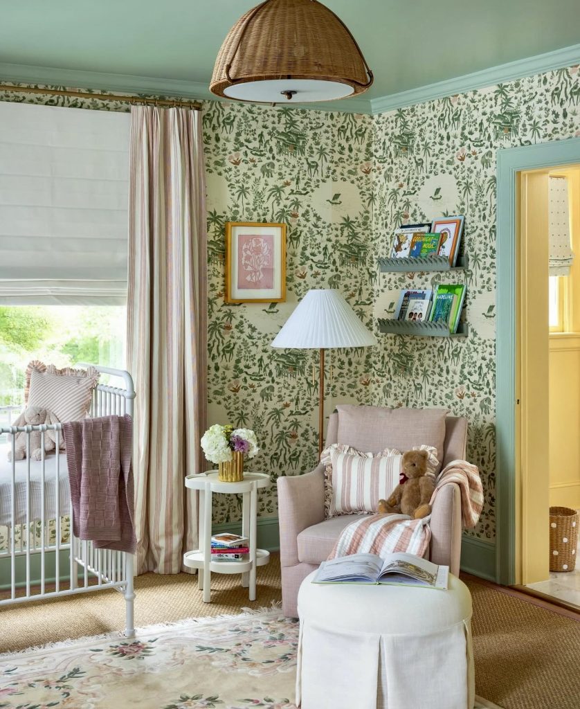 Embracing a green and floral aesthetic, this nursery channels cozy cottage charm. The patterned wallpaper gives it a whimsical feel, while the muted pastels keep the look serene rather than overwhelming. Woven textures, soft pink accents, and layered fabrics create an inviting retreat that feels handcrafted. The floral rug ties everything together, adding vintage romance to the design. It’s a beautiful example of how to make a nursery feel grounded in nature yet still incredibly stylish.