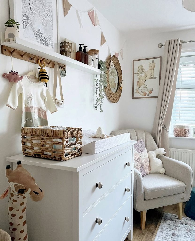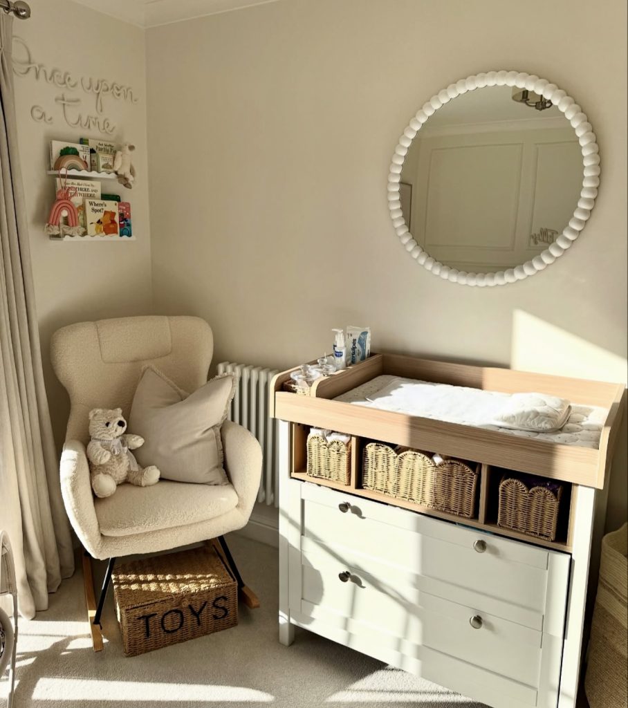 This space feels effortlessly comforting—proof that function can coexist beautifully with design. The warm sunlight, woven baskets, and textured chair evoke subtle vintage and boho influences that feel grounded and natural. Soft neutrals allow for flexibility, pairing well with future colorful or green accents as the baby grows. The circular mirror adds light and balance, making this corner feel both spacious and inviting. It’s a nurturing nook where everyday routines feel like small, tender rituals.