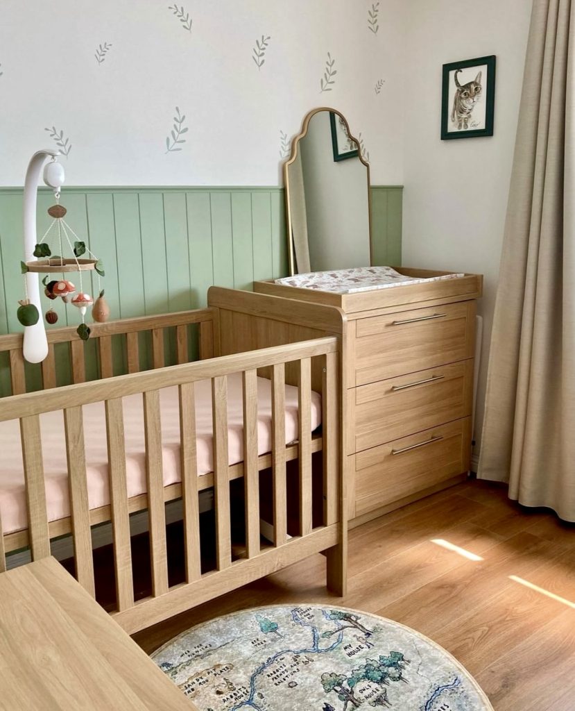 The calmness of nature is captured in this nursery with the delicate green wall paneling and the organic wooden furnishings. It feels fresh, cozy, and minimalist, just right for a small room that is designed for serenity. The boho charm of the leafy wall accents and botanical color scheme promises a timelessness to the room. As for the room’s femininity, the subtle pink bedding does the job without tipping the room too far into the pink spectrum. It is a great manifestation of 2026’s nature-forward ambition, where calm as well as sustainability meets in style.
