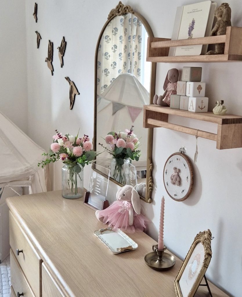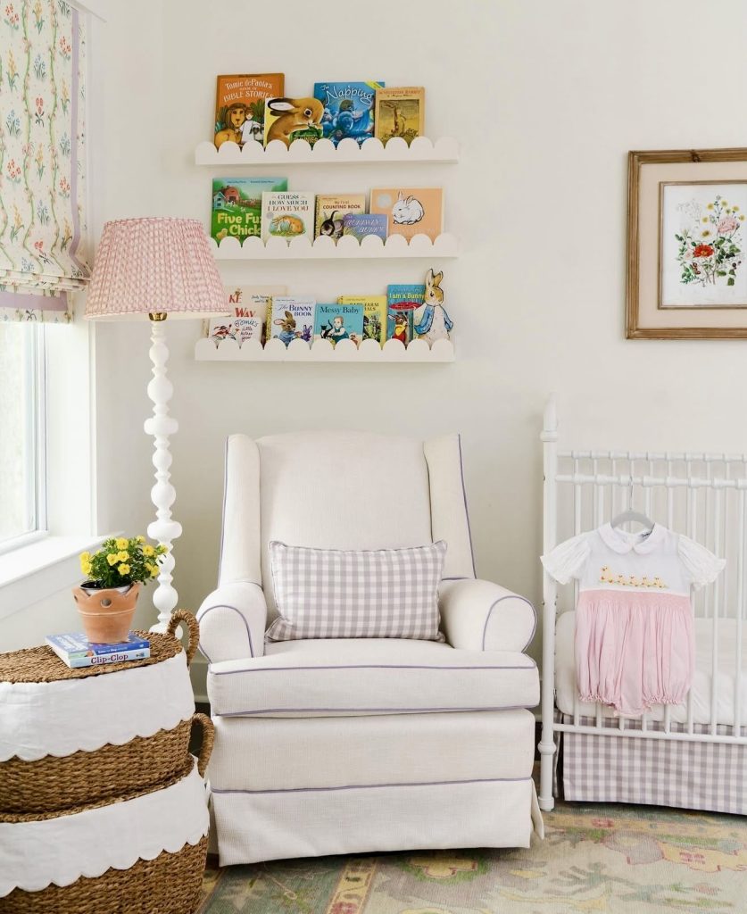 The Romantic Nursery has an updated, detailed celebration of a feminine vintage nursery. The vintage spring English garden inspiration is made more romantic with the detailed florals and the spring pastel colorings of blush, cream, and green. The nursery is made more personal with the soft toys and the framed embroidered artwork, and the nursery is made more characterful with the keepsakes and books, where every shelf tells a story. It is elegant and does not feel like staged proof. It is the personal treasured details that result in a nursery that is timeless and vintage.