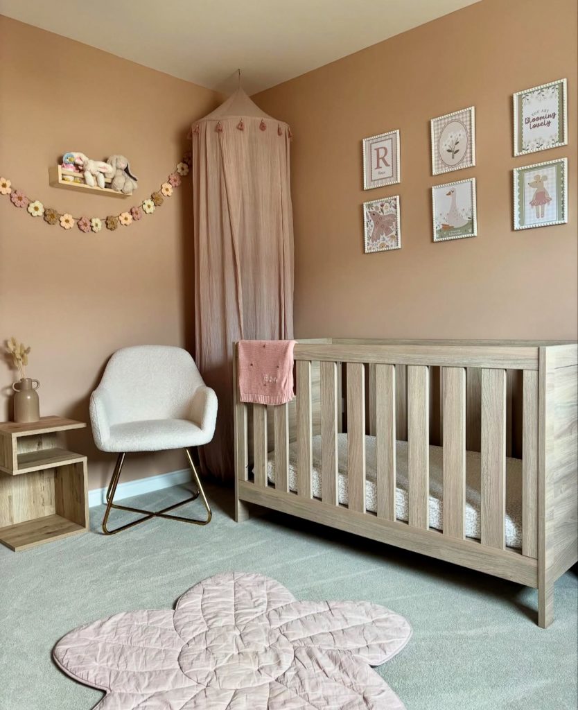 This nursery showcases terracotta walls and boho designs. The warm confidence of the space is a sign of modern femininity. Subtle pinks and soft fabrics are layered to bring visual personality and comfort. The neutral woods with pink accents merge to form a relaxingly sunlit tune. This space is a harmonious balance of strength and soft femininity. It is a cozy retreat.