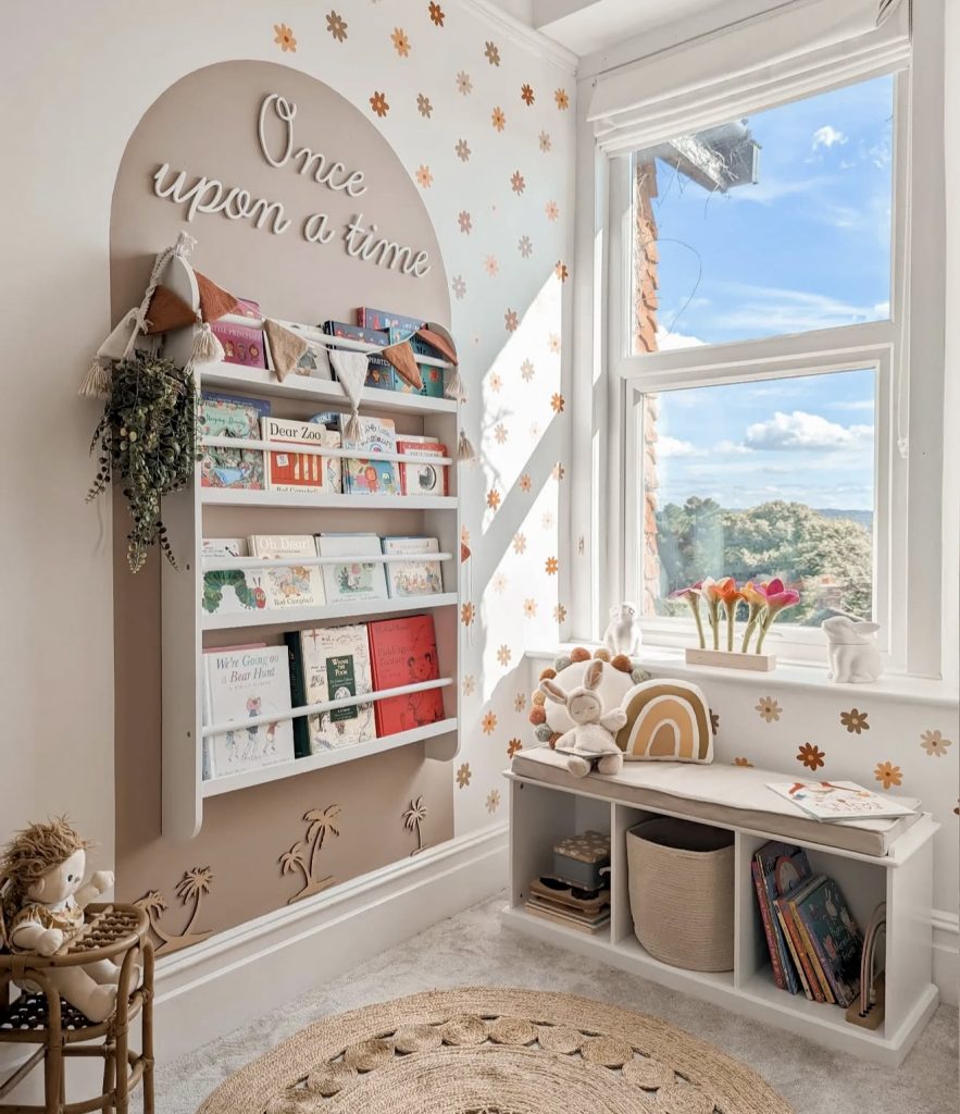 This reading nook feels like stepping into a fairy tale, filled with personality and warmth. The “Once upon a time” lettering above the book display adds a magical storytelling vibe, making it a perfect zone for nurturing creativity. Earthy tones, sunlit walls, and natural materials bring a soft boho and colorful energy without overwhelming the senses. The rattan accents and the simple vintage rug make the corner feel timeless yet playful. It’s a reminder that a nursery isn’t just for sleeping—it’s a space where imagination begins.