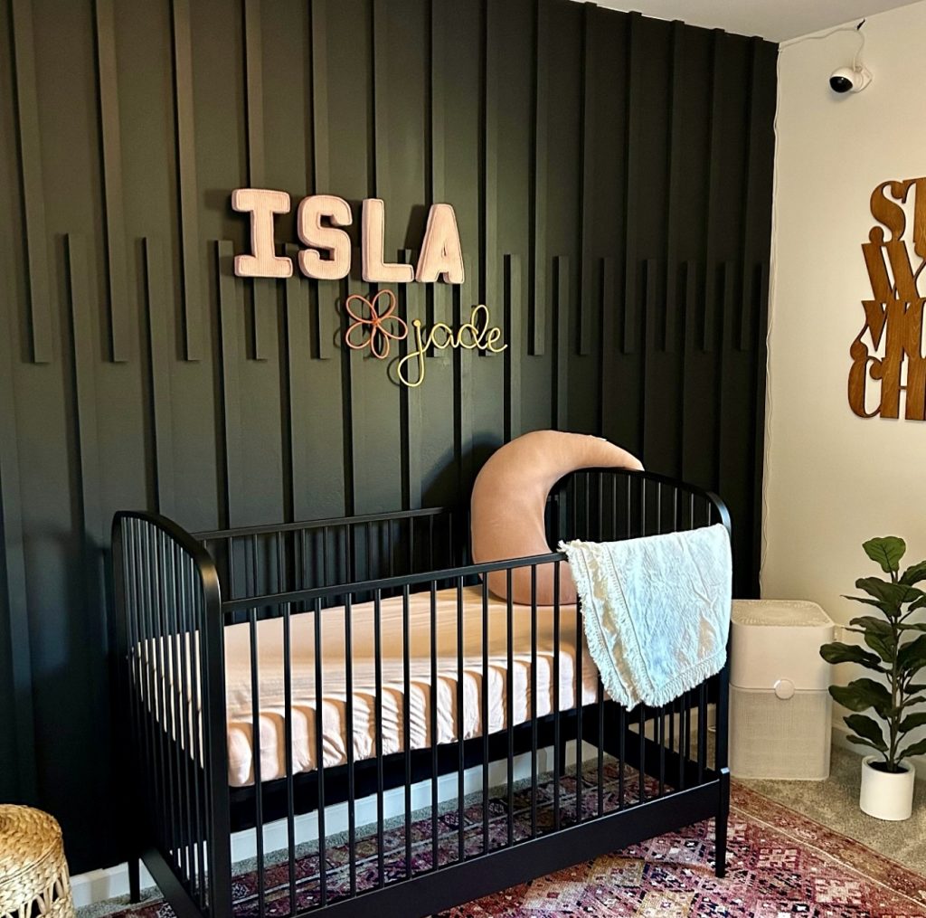 This design takes a fearless step into 2026 with its dramatic black feature wall—a stunning example of a not-pink, modern nursery. The bold backdrop makes the soft blush bedding and textured rug pop beautifully. Gold and wood accents bring warmth, while the colorful rug introduces playful contrast. This look is chic, stylish, and perfect for design-savvy parents who aren’t afraid to make a statement. It’s proof that a nursery can be both edgy and deeply comforting.