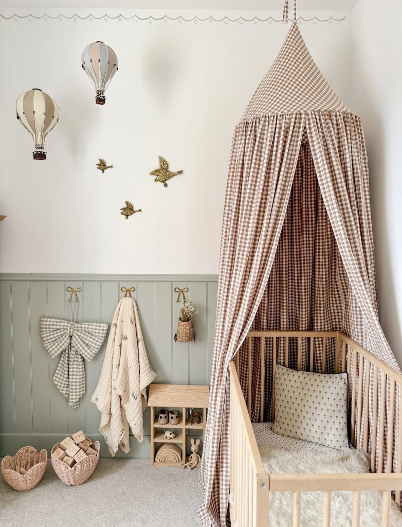 This nursery references vintage design with a sense of whimsy, as well as modern comforts, using checkered canopies and sage green paneling. Balloon-themed decor bestows a sense of watchful adventure and a brassy finish, boldness, and sophistication. The crib and braided baskets in natural wood maintain grounding in boho simplicity. At a modest spatial scale, the room is richly textured and intimately warmed with decor. The sense of warmth is fresh and nostalgic for parents of 2026 and quiet elegance.