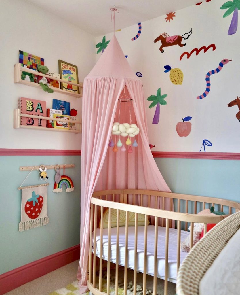 This space bursts with creativity and joy, proving that a nursery can be fun and stylish at once. The colorful mural and pink canopy create a happy, uplifting atmosphere that sparks imagination. Natural wood furniture grounds the palette, while cheerful wall hangings add a boho touch. The contrast of teal and blush feels modern and unexpected, ideal for families who love artful design. It’s a delightful example of how to create a lively space without losing harmony.