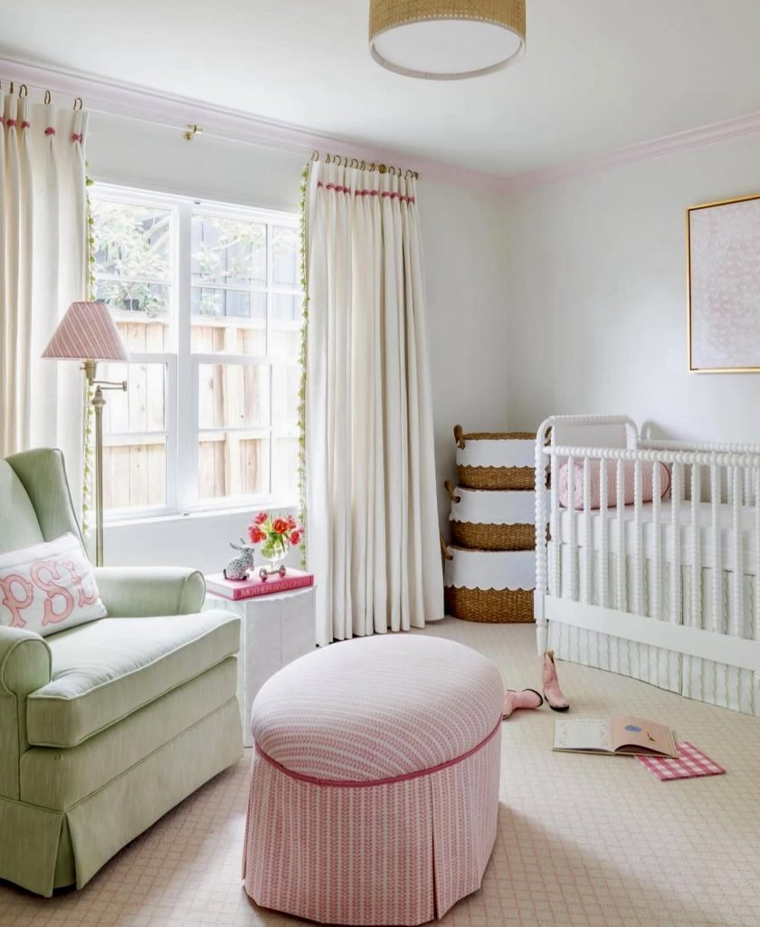 This serene nursery embraces a classic pink palette paired with soft neutrals for an elegant, timeless look. The pale green armchair and ottoman add just the right touch of sophistication while keeping the mood gentle and cozy. Woven baskets near the crib add natural warmth, balancing the refined tones with subtle texture. The room’s symmetry and sunlight create a calm, airy vibe perfect for soothing naps. It’s a style that feels both traditional and fresh—an ideal choice for families who love soft femininity without excess frills.