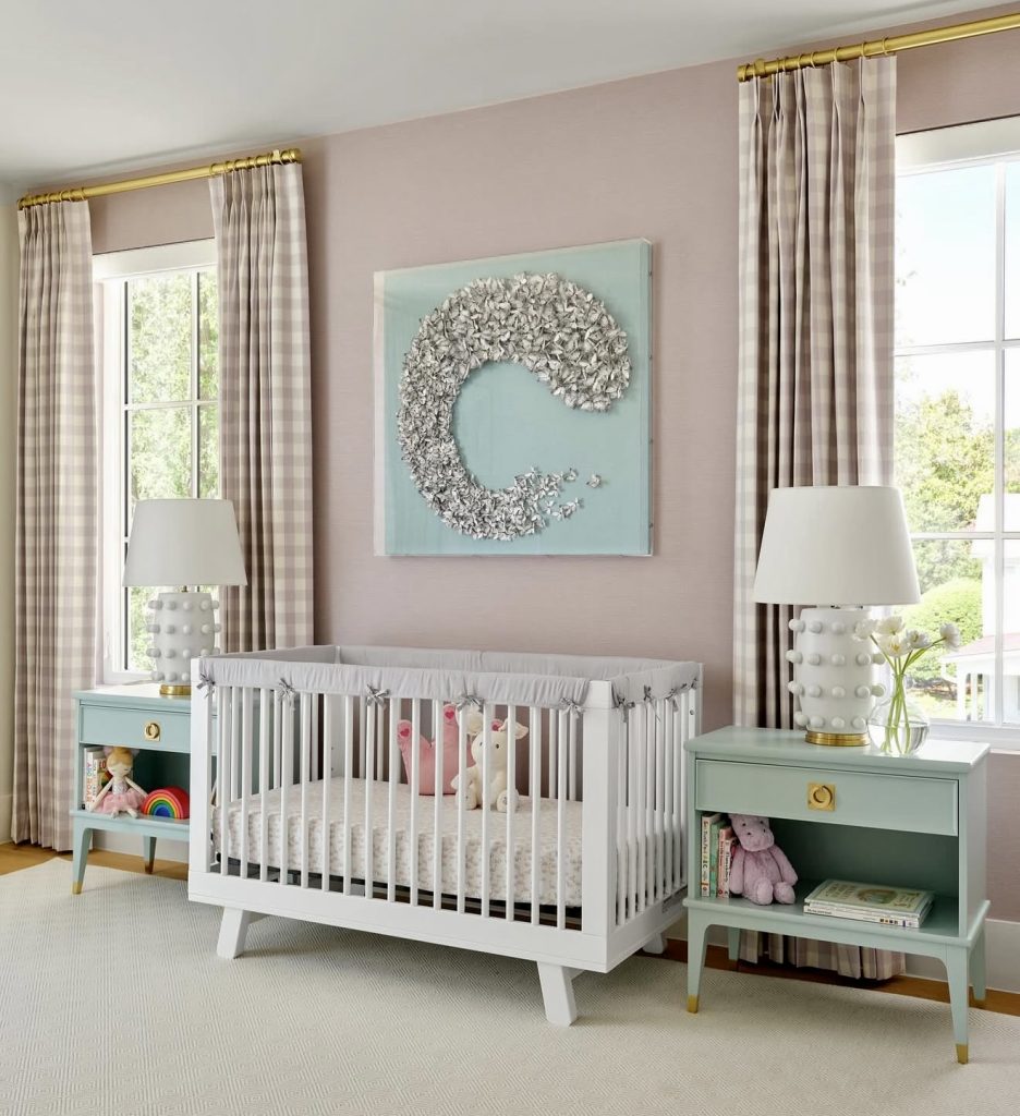 The bright and colorful nursery is designed to blend modern lines with playful character. The pastel green nightstands contrast with the soft blush backdrop beautifully, which gives the space a refreshing touch, making the statement artwork above the crib even more noticeable. The cheerful, yet polished feeling of the space is thanks to the balanced checkered curtains and warm light. The symmetry is meant to settle the fresh parents, who appreciate modern design. The nursery feels confident and current andis full of cheerful sophistication.
