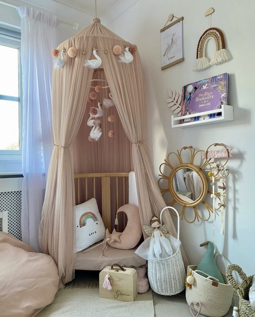 This boho nursery radiates creativity and playful elegance. The soft blush canopy, hanging swans, and rainbow pillow create a magical little corner that sparks imagination. Textured baskets, wooden toys, and rattan details infuse warmth and authenticity into the space. Despite its compact size, it feels open and inspired—an ideal design for a small room with a big personality. Every detail, from the moon pillow to the fairy doll, reflects thoughtful storytelling and effortless charm.
