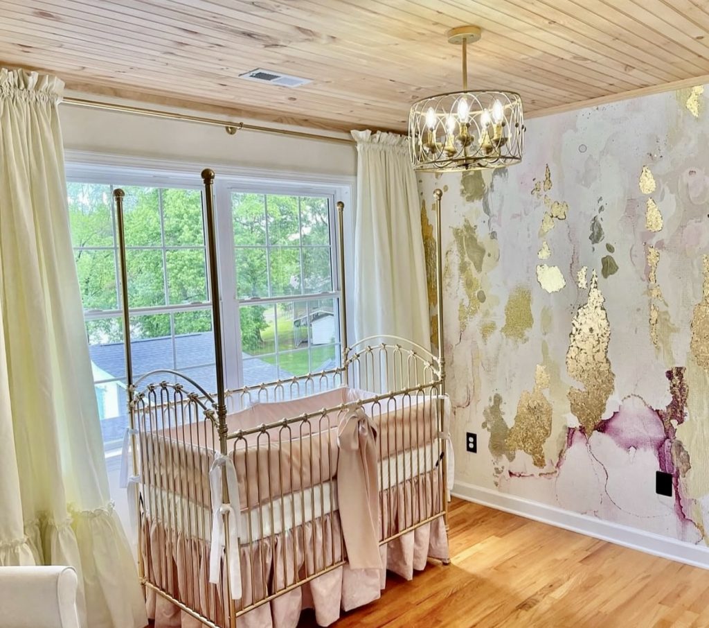This nursery radiates pure sophistication, blending pink accents with shimmering gold for a look that feels both regal and warm. The metallic crib stands as a centerpiece, its graceful curves highlighted by the natural light streaming in through the large windows. A marbled wall with gold leaf detailing brings subtle drama, transforming the space into a chic retreat. The wooden ceiling adds organic balance to the glamorous finishes, creating depth and coziness. It’s a design for parents who love a bit of luxury without losing the heartwarming feel of a baby’s room.