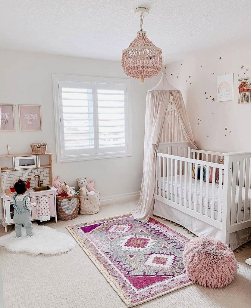This boho-inspired nursery blends joy and function effortlessly, creating a bright and welcoming atmosphere. The colorful rug and pink pouf bring vibrancy, while the star decals and canopy add a dreamy touch perfect for imaginative play. The space balances minimalism with texture, offering softness through layered textiles and woven baskets. It’s a nursery where every detail feels intentional yet unpretentious—crafted for real family life. Ideal for a small room, this layout shows that even limited space can feel expansive when filled with warmth and creativity.