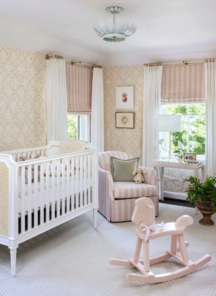 This room captures vintage charm through its gentle mix of soft pink, cream, and sage tones. The striped chair and patterned wallpaper nod to old-world design, yet the overall effect feels refreshingly modern. Clean white furniture keeps the space airy, while floral artwork adds personality and sweetness. The floral touches are delicate, proving that baby rooms can embrace traditional motifs without feeling dated. It’s an exquisite balance of comfort and style—perfect for those who adore timeless interiors with a modern edge.