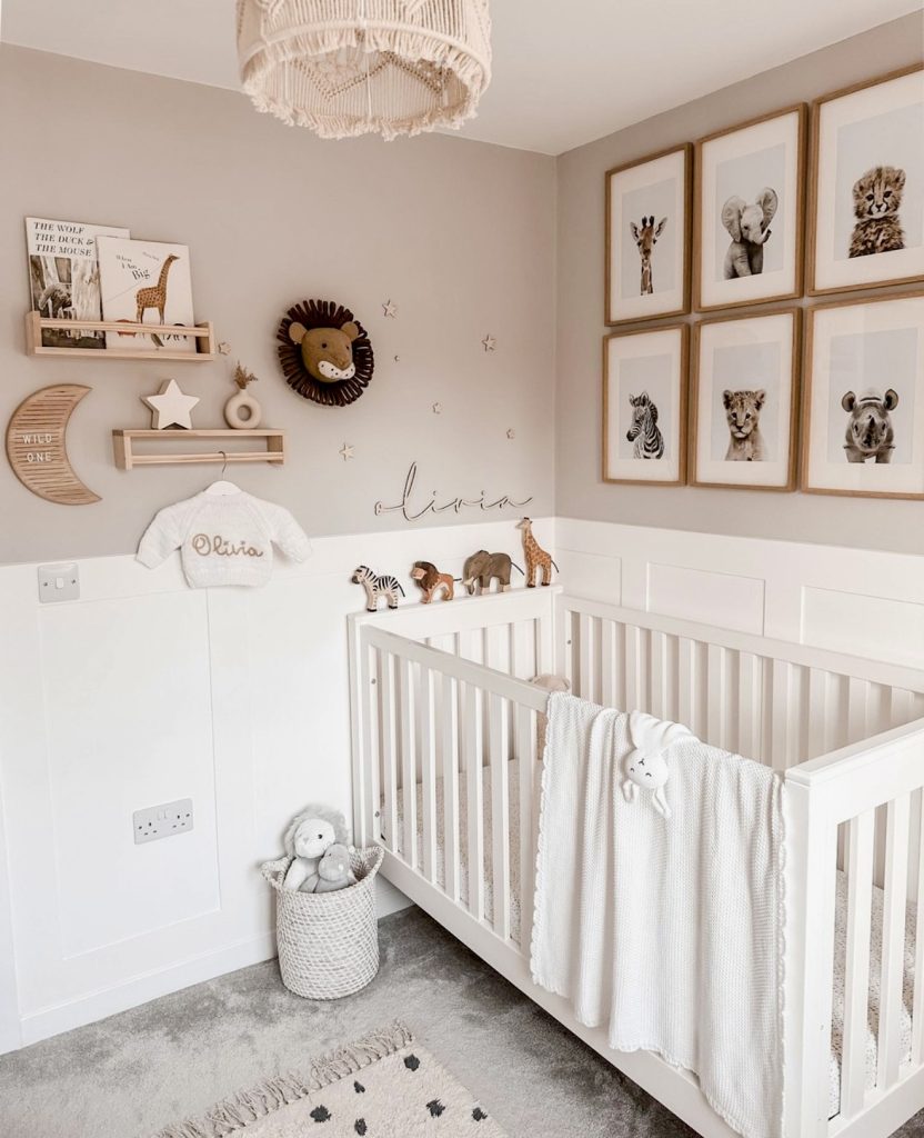 Here, the natural world becomes the inspiration—adorable animal prints, wooden accents, and earthy tones define this not-pink nursery. The balance between clean lines and tactile materials brings a refined boho feel, with just enough whimsy to capture a child’s wonder. The framed safari portraits are modern yet comforting, blending easily into both green and neutral palettes. Thoughtful storage and minimal clutter make this setup ideal for a small room where practicality meets design. It’s a chic, gender-neutral approach that feels timeless and full of heart.