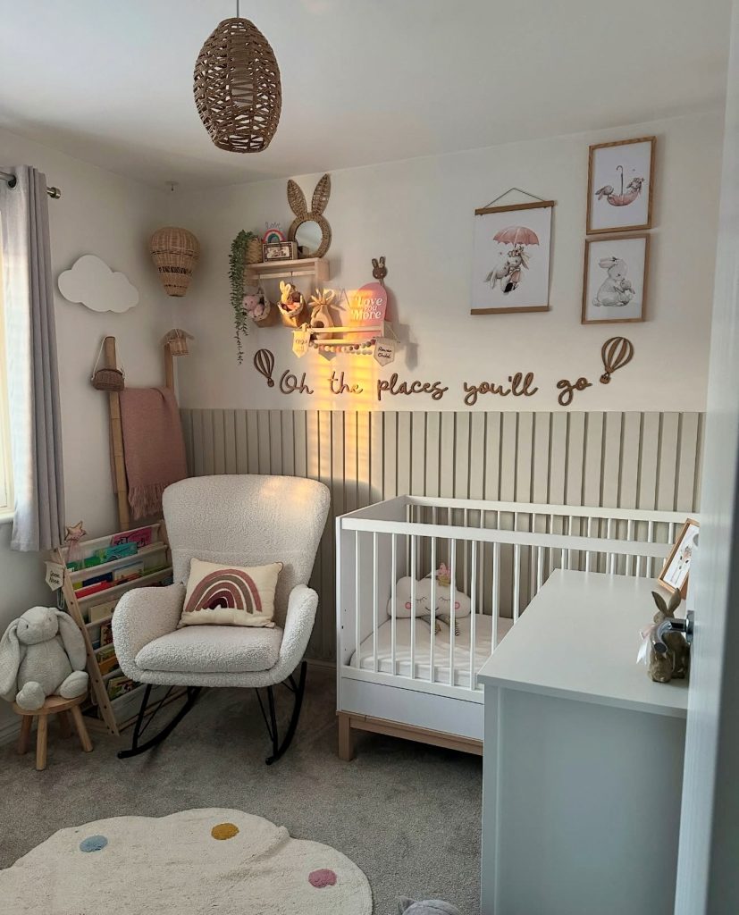 Created with the reality of parenting in focus, this nursery achieves an ideal equilibrium with its inviting and functional design elements. Light shades and soft textures impart a calming boho ambiance, which is beautifully complemented by the woven baskets and natural wood. The minimal garland and the thoughtfully curated wall art contribute to a sense of individuality and keep the space from feeling cluttered, which is a crucial consideration in a small room. The plush chair and soft lighting create a perfect atmosphere for nighttime cuddles. It is the kind of space that brings joy, feels homogeneous and personal, and where every element is a heartfelt and purposeful contribution.
