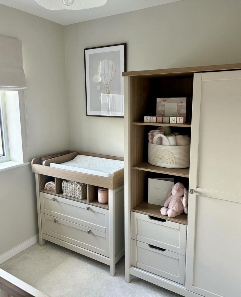 Here’s a nursery setup that proves functionality can look effortlessly elegant. The neutral color palette, accented by soft wood tones, feels serene and sophisticated—ideal for a small room. The minimalist layout makes every inch count, while subtle boho details like woven baskets add warmth. Soft pink accents and gentle curves lend a feminine touch without making the space overly pink. It’s a timeless, calming corner designed for comfort and style.