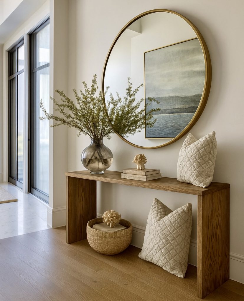 This serene and neutral hallway captures one of the most important hallway ideas for 2026: soft minimalism with warmth. The oversized round mirror anchors the vignette while visually expanding a long narrow entry, a favorite designer trick for small or modern homes. A slim wooden console introduces texture without overwhelming the space, and the woven basket adds subtle storage—perfect for gloves, scarves, or quick-grab items. What makes this design relatable is how livable it feels: cozy pillows, delicate greenery, and layered books create a calming welcome that suits both contemporary builds and renovated 1930s cottages. It’s the kind of entrance that eases you in after a long day and sets the tone for a home that values comfort as much as style.