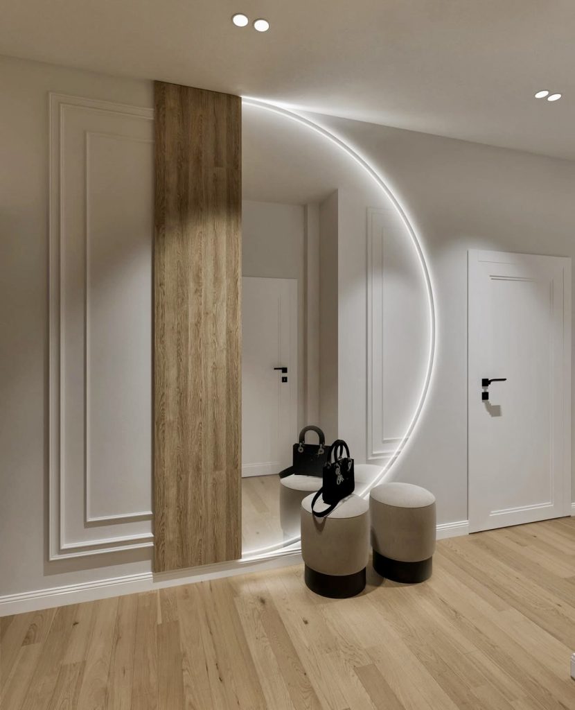 For homeowners craving bold, innovative ideas, this hallway is a standout example of modern decor done right. The oversized illuminated curve framing the mirror creates a sculptural focal point that instantly elevates the modern feel of the entrance space. A slim wood panel balances the cool glow with natural warmth, preventing the design from veering too futuristic. Compact stools offer functional seating in a narrow or tiny hallway while keeping the floor plan open. This style leans into the 2026 trend of ambient architectural lighting, a favorite among designers transforming ordinary entrance interiors into something cinematic. It’s dramatic yet surprisingly practical—proof that small spaces can still make a grand statement.