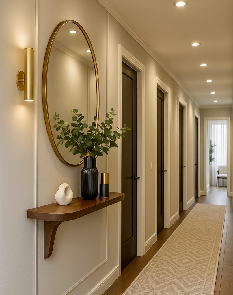 This corridor features a beautifully lit mix of modern touches with neoclassical detailing, an enticing option for long, narrow space households. It even includes a slim floating shelf for sheer decorative functionality, ensuring enough walking space for hallway usage, especially when the hallway also serves as a connector to the bedroom wing and adjacent living area. Bathroom sconces and a large brass mirror bring atmosphere and sheen, instantly lifting the space to boutique-hotel warmth and softness in interior design. The brightness of the knotted runner makes the trim walls of the pattern neutral, subtly elongating the view and inviting an architectural solution for the polished, understated hallway 2026 idea.