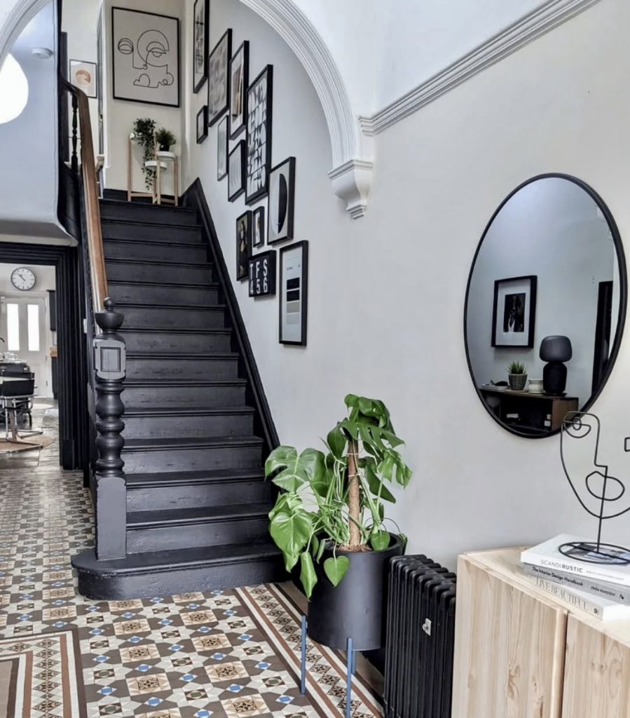 This striking entry celebrates the architectural drama of a Victorian home while embracing the bold, graphic trends forecasted for 2026. The dark-painted stairs and trim ground the space with depth and character, making the patterned tile floor feel even more vibrant. A curated gallery wall climbs upward in a rhythmic composition that draws attention to the height of the home—an especially effective approach for hallway spaces that feel narrow or vertically dominant. The soft curves of the round mirror contrast beautifully with the angles of the artwork, and the addition of fresh greenery brings life to the otherwise moody palette. This design strikes the perfect balance between historic charm and modern decor, showing how older homes can thrive through confident, artistic styling.