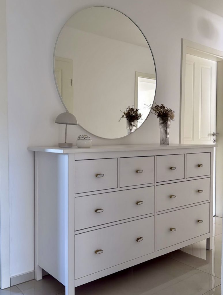 This serene hallway embraces the power of a calm, neutral design, making it ideal for apartments or homes longing for visual quiet. The oversized mirror amplifies natural light and adds a sense of openness, helping brighten what could otherwise feel like a narrow or dim corridor. The dresser offers generous storage without sacrificing the clean, architectural simplicity that defines 2026’s minimal movement, a trend heavily praised by design editors at ELLE Decor and Real Simple. Soft metallic hardware provides just enough detail to keep the look elevated. This piece is hallway design at its most restful—streamlined, uncluttered, yet still warmly personal.