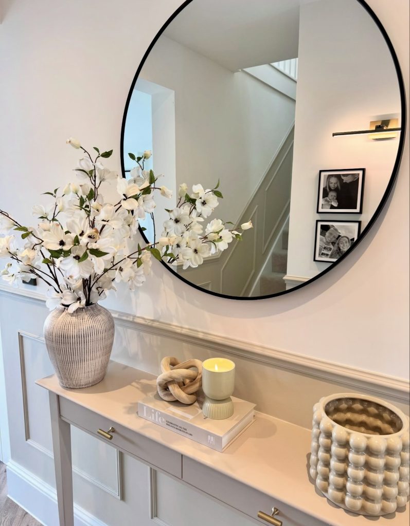 This fresh and uplifting entryway shows how thoughtful styling can make even a narrow hall feel gracious and warm. The oversized round mirror reflects the stairs and upper level, subtly expanding the space and adding architectural interest. Delicate white florals and tactile ceramics create an elegant neutral palette that feels both soothing and refined—very much in line with 2026’s soft-minimalist trend. The slim console is perfect for adding personality without disrupting the flow of movement, especially valuable in narrow entrance layouts. Accents like a small book stack and sculptural candle break up the symmetry in a way that feels personal and lived-in, echoing the approachable style popularized by influencers like The Styled Home Edit.