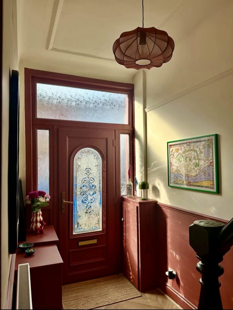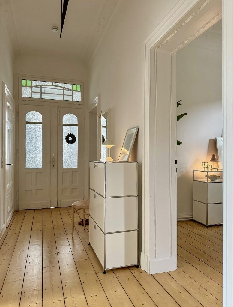 This bright, airy hallway is a lesson in restraint, using Scandinavian-inspired simplicity to make a long, narrow layout feel serene and purposeful. The clean-lined storage unit is a lifesaver for anyone living in a compact apartment, offering vertical organization without disrupting the architecture. Soft wood floors paired with frosted glass doors create a fresh and timeless entrance interior design, one that feels equally suited to a small city flat or an upstairs landing in a family home. The subtle touch of green stained glass in the transom windows adds character while keeping the palette calm and cohesive. This space leans into the “quiet luxury” trend predicted by interior tastemakers like Athena Calderone—understated, thoughtful, and deeply livable.