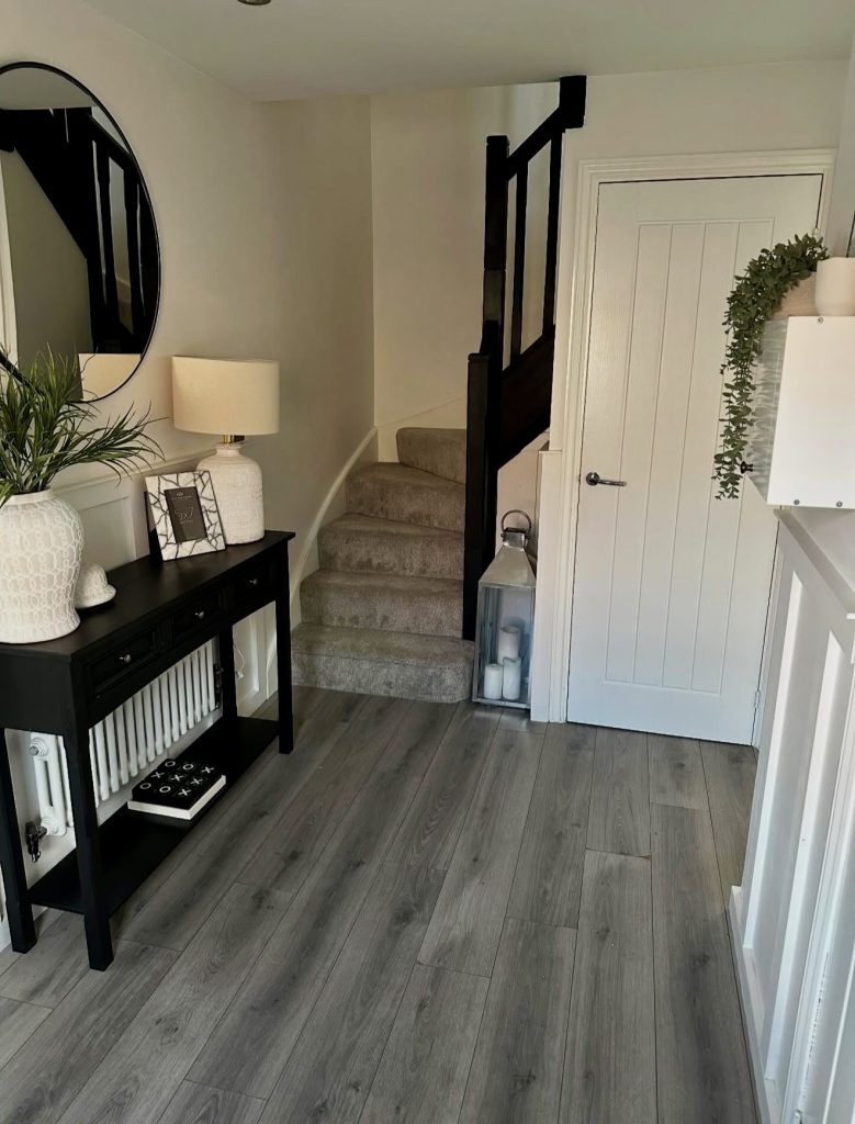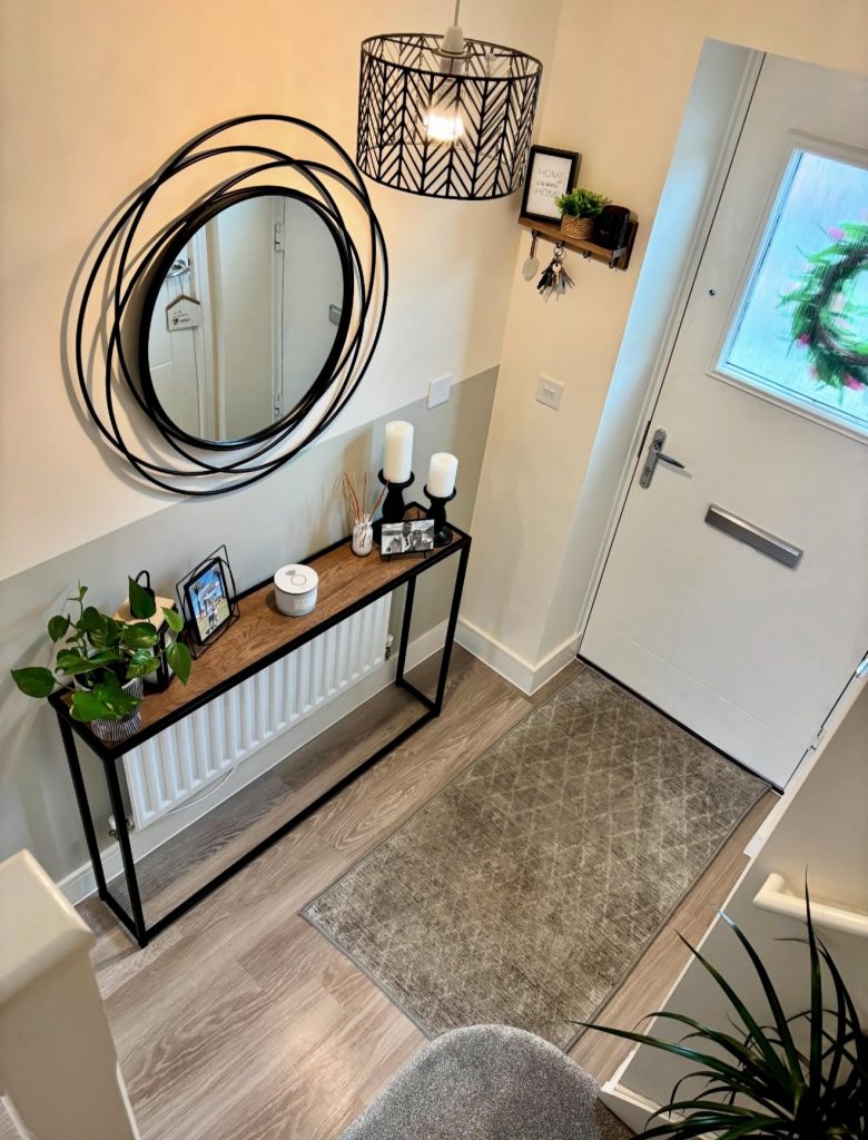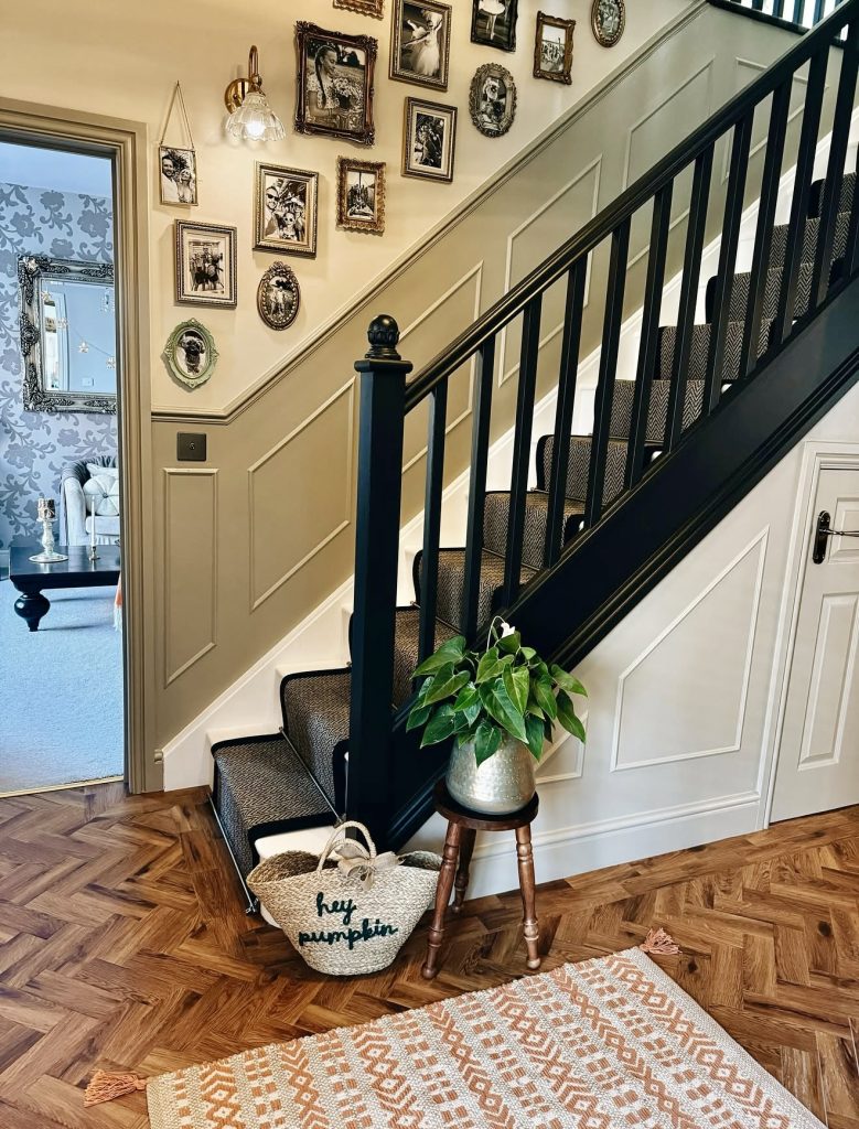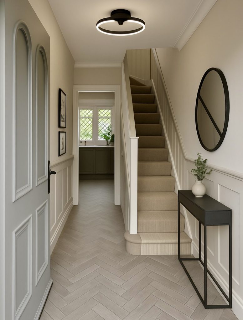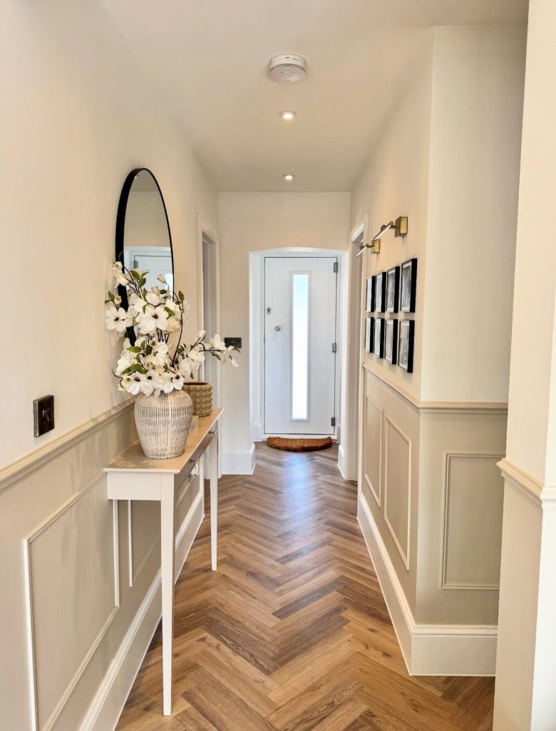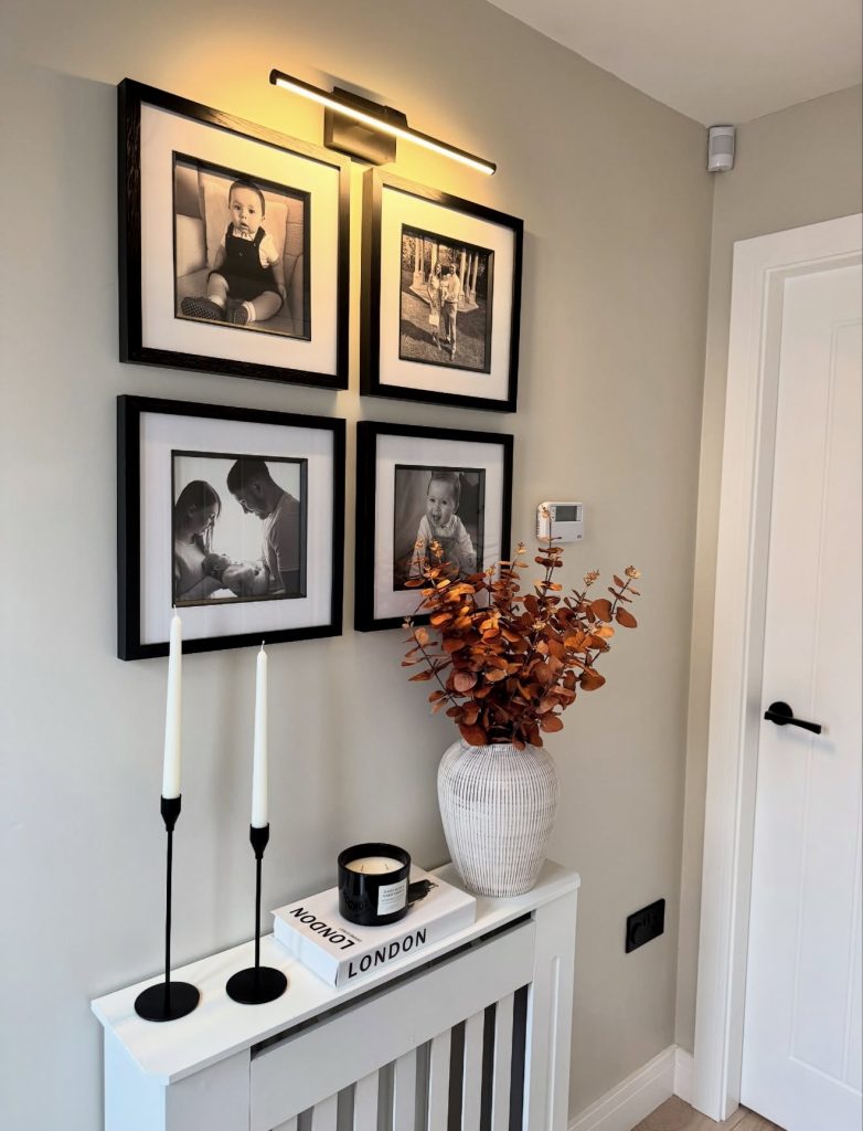 This warm, curated hallway highlights how personal storytelling can elevate even the simplest modern entrance layout. A symmetrical grid of black-and-white photos becomes the focal point, illuminated by a sleek picture light that gives the arrangement gallery-level polish. The slender radiator cover doubles as a styling ledge—an excellent trick for small, narrow hallways where surface space is scarce. Tall, minimalist candlesticks and an autumnal floral arrangement add seasonal charm without overwhelming the clean lines of the design. This blend of functionality and sentiment reflects a growing 2026 trend: hallways that aren’t just transition points but spaces that celebrate family life in a subtle, design-forward way.