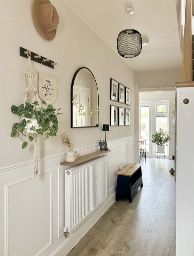 Here, a bright and cheerful hallway shows how personality can shine in a small, narrow space without feeling cluttered. The playful wall hooks, hanging greenery, and curated prints balance charm with practicality, and the slim shelf above the radiator adds just enough storage for everyday items. The arched mirror instantly opens up what is otherwise a narrow corridor, a must-have for maximizing space in apartment layouts or upstairs hall landings. The black wire pendant adds a slightly modern contrast, keeping the look youthful and fresh—very much in line with what lifestyle bloggers like Chris Loves Julia predict for 2026 interiors. This hallway feels lived-in, welcoming, and ideal for busy families who want beauty without losing functionality.