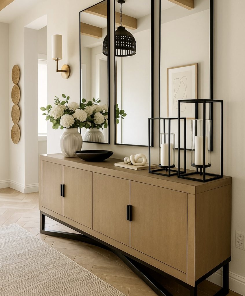 This refined hallway embraces a sophisticated, modern entrance look, combining warm wood cabinetry with striking black accents that feel both architectural and inviting. The trio of tall mirror panels visually expands the space—an excellent solution for a long or narrow entry where added depth is welcome. Crisp white florals, sculptural objects, and contemporary candle lanterns create a curated, boutique-hotel ambiance, while the soft neutral palette keeps everything grounded and timeless. This design aligns with the “quiet luxury” movement seen across top design publications, prioritizing clean lines, high-quality materials, and a sense of calm sophistication that sets the tone for the entire home.