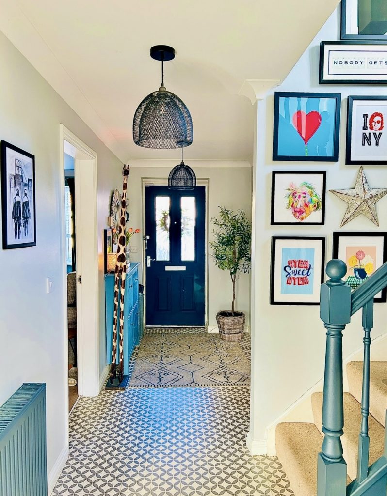23. Colorful Artistic Hallway with Blue Door Statement