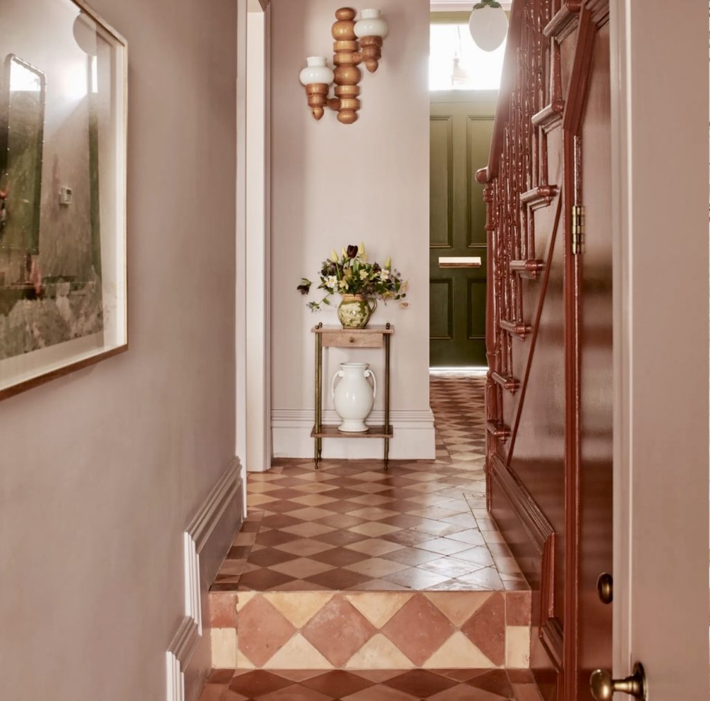 This hallway captures the spirit of an older Victorian or 1930s home perfectly. With terracotta floors and deep wood accents, it captures the rich, inviting charm of the style to create a perfect warm passageway. The small console with layered ceramics adds an understated charm without competing with the long lines of the corridor, while the sculptural wall sconces cast the warm light in an artful vintage manner. The paired muted pink walls soften the space and draw attention to the historic staircase, blending the new and the old in perfect harmony. It’s a wonderful example of how to pair contemporary design with heritage architecture to elevate the entrance while keeping it true to the style.