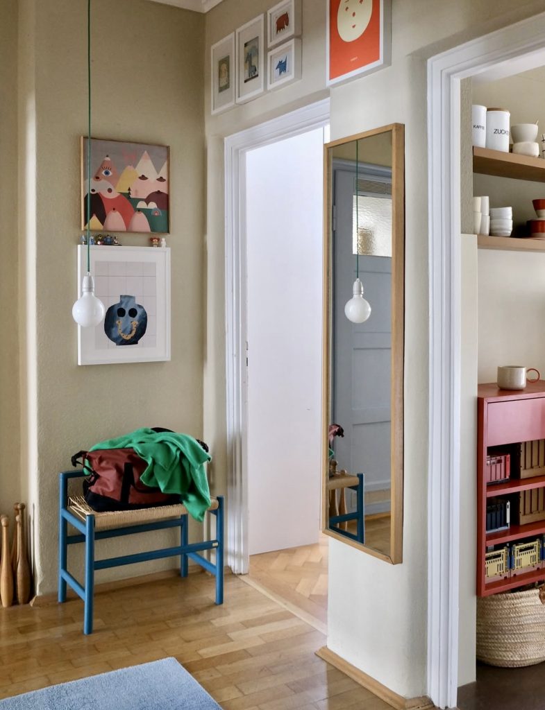 Bright artwork and cheerful accents turn this hallway into a joyful, design-forward space that feels especially refreshing in a family home. The slim blue bench adds a pop of color without crowding the floor plan, making it ideal for small, narrow layouts or casual entrance areas that serve multiple daily functions. A simple rectangular mirror creates balance while reflecting light between rooms, and the pendant light with its visible green cord adds a whimsical touch that fits beautifully with the colorful prints overhead. This approach to hallway styling aligns with 2026’s shift toward expressive modern decor, where personality and playfulness matter just as much as function.