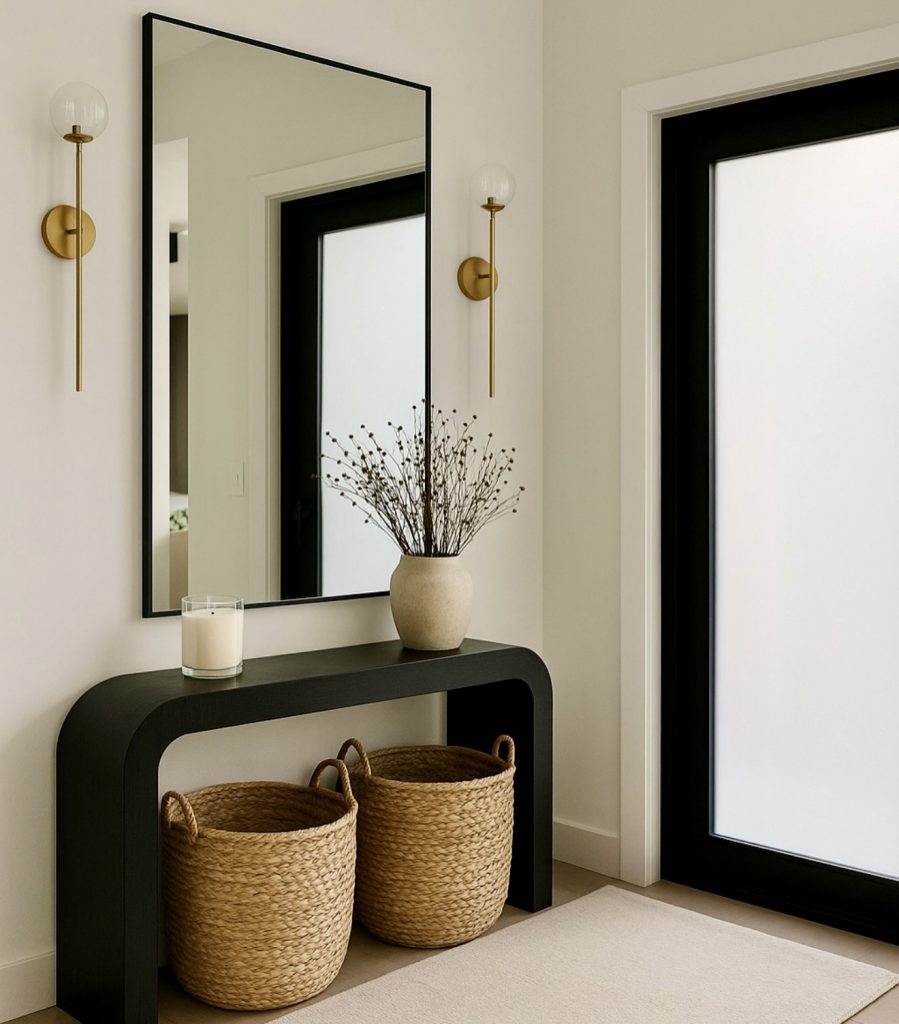 This polished and quietly luxurious hallway reflects a growing trend in modern entrance design: bold simplicity paired with sculptural accents. The streamlined black console softens its edges with a rounded silhouette, offering hidden practicality thanks to large woven baskets that provide generous storage—something essential in U.S. homes with long or narrow entries. Brass sconces bring a warm glow that lifts the space, proving that small upgrades can dramatically shift a hallway’s mood into something more moody and refined. The oversized rectangular mirror adds height and opens up the view, a timeless trick that works beautifully for both new builds and older homes undergoing thoughtful updates.