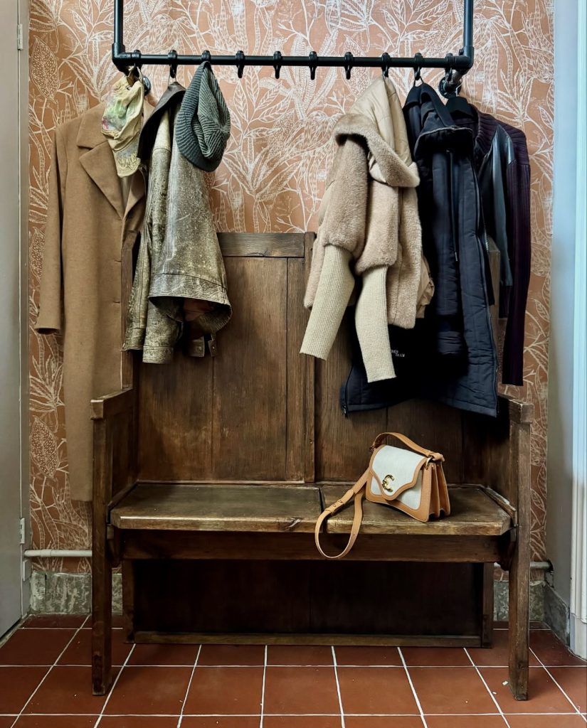 This earthy entryway embraces a rustic, cottage-meets-industrial aesthetic that feels both nostalgic and practical. The sturdy wooden bench offers a comfortable landing spot in a narrow or long entrance, while the overhead hanging rail provides generous storage for coats, scarves, and seasonal layers—a lifesaver in colder climates. The botanical wallpaper adds depth and a cozy moodiness that contrasts beautifully with the raw materials, creating a layered, collected look. It’s the kind of hallway that feels like it belongs in an old farmhouse or restored Victorian home, full of character and daily warmth.