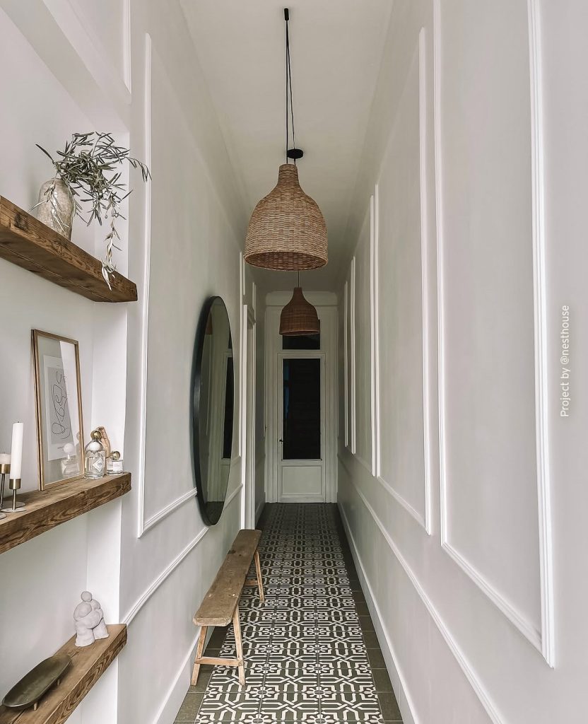 This long, narrow hallway is a great example of how careful detailing can make even the smallest space look like a design feature. The patterned floor tile introduces rhythm and visual interest, guiding the eye naturally toward the door at the very end of the corridor. Slim wooden shelves hold curated decor—candles, sculptural pieces, and delicate art—adding warmth without intruding into the walkway. A rustic bench and oversized round mirror lighten the look and help expand the proportions, while woven pendant lights bring a soft, natural texture overhead. It’s an inspiring example of how layering materials and keeping proportions streamlined can elevate a long, challenging hallway into something truly memorable.