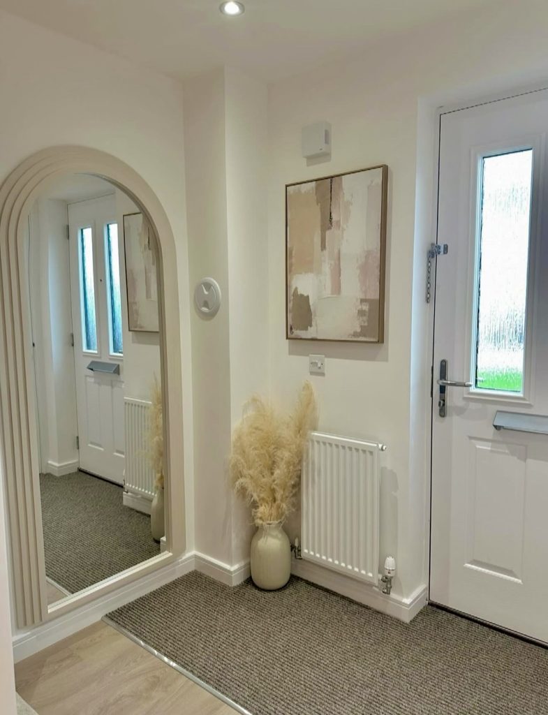 This serene hallway embraces soft contemporary design, using texture, shape, and tone to create an effortlessly calming first impression. The tall arched mirror becomes the focal point, elegantly stretching the wall height and making the space feel larger. Pale abstract artwork and a large vase of pampas grass introduce organic softness, while neutral carpeting and clean white walls keep the overall look cohesive. It’s the kind of entryway that feels instantly peaceful—a sanctuary-like welcome after a long day, proving that simple materials used thoughtfully can yield stunning results.