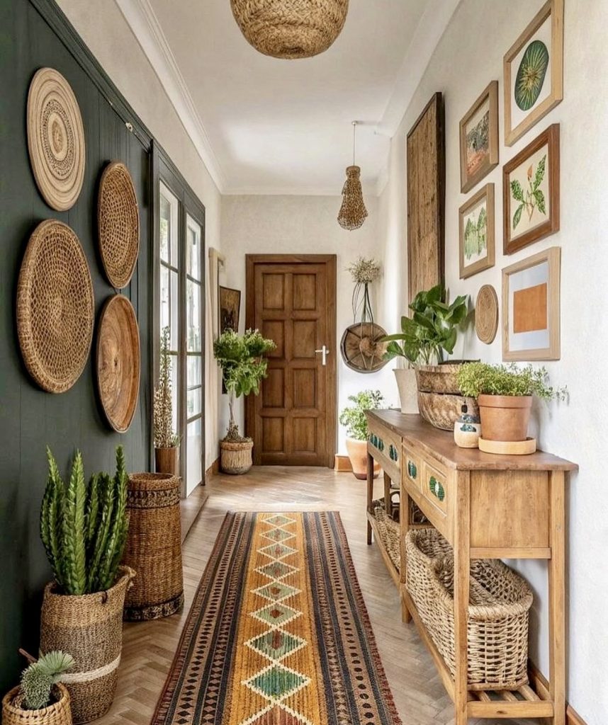 This vibrant, earthy hallway channels a charming cottage aesthetic that feels both nostalgic and fresh for 2026. The combination of woven wall décor, greenery, and warm wood tones brings personality into a long corridor without shrinking it—a helpful approach for homeowners dealing with older Victorian or 1930s layouts. The patterned runner elongates the hallway, guiding the eye toward the entrance while softening the mood. Clever use of baskets and lower shelving gives you plenty of functional storage, proving that style and practicality can absolutely coexist. This design resonates with nature-loving homeowners, offering a grounded, welcoming entrance interior design that feels handcrafted and genuinely personal.