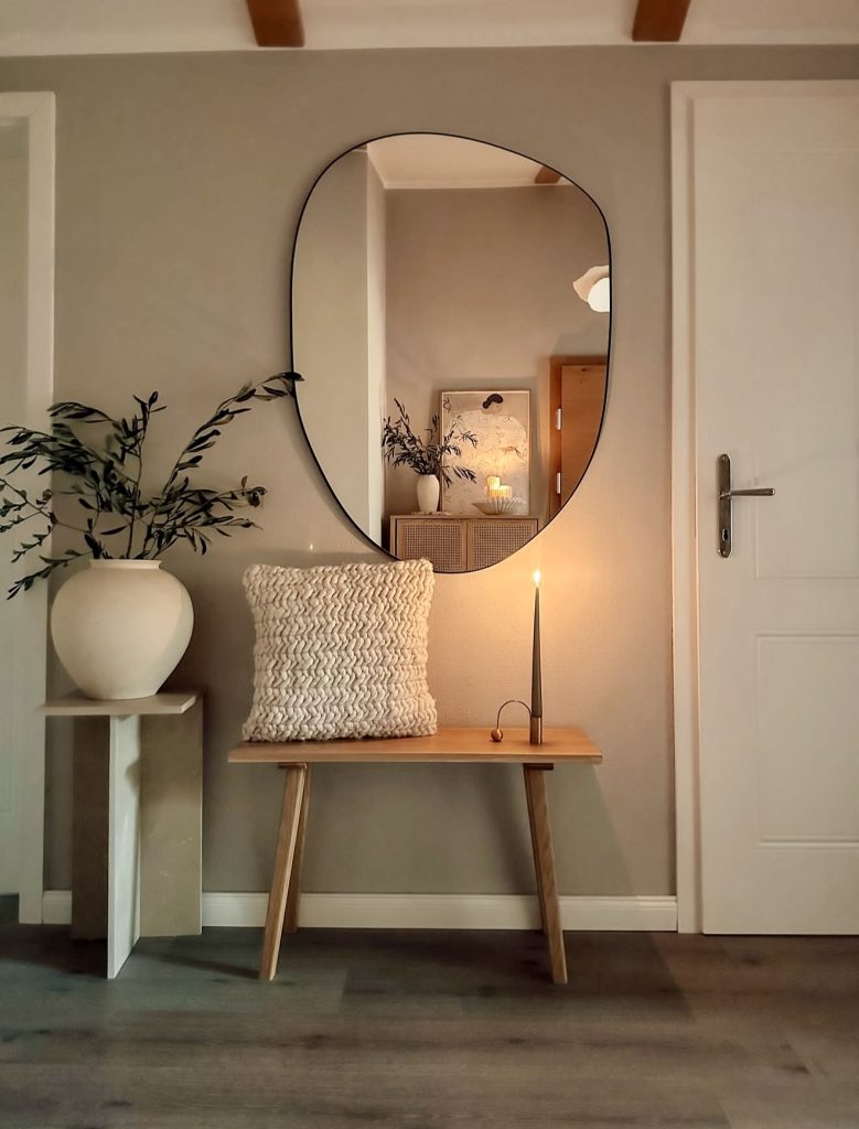 This calming nook reflects the Scandinavian-inspired modern decor that continues to dominate hallway trends in 2026. Organic shapes, like the irregular mirror, pair beautifully with the clean-lined bench and textured pillow, creating a cozy moment within a tiny or narrow hallway. The warm glow of a single candle adds an inviting touch—a reminder that ambiance matters, even in transitional spaces. Subtle greenery and soft neutrals make this ideal for apartment living or as a quiet spot near stairs and upper-level landings. The look is restrained yet comforting, giving homeowners a simple blueprint for elevating their entrance interior design with minimal effort.