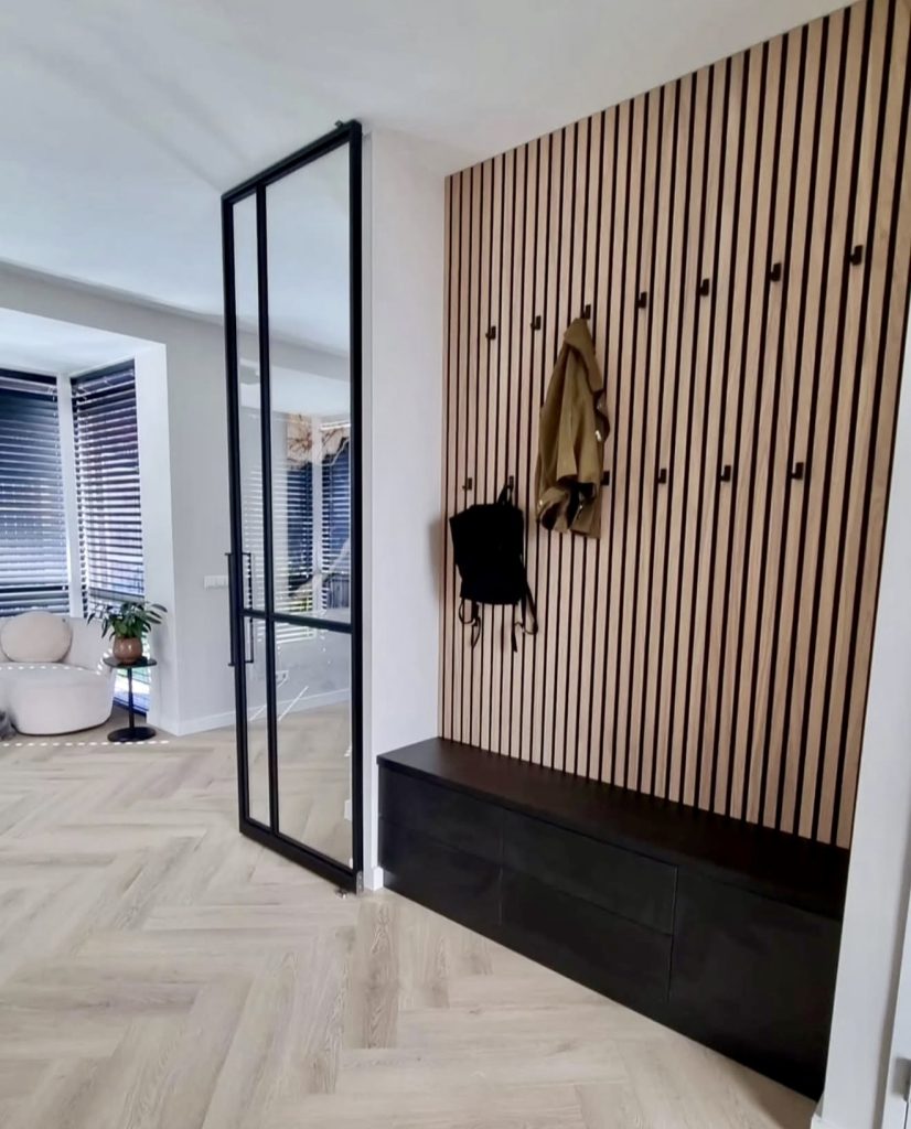 6. Sleek Slatted Entry Wall with Modern Storage
