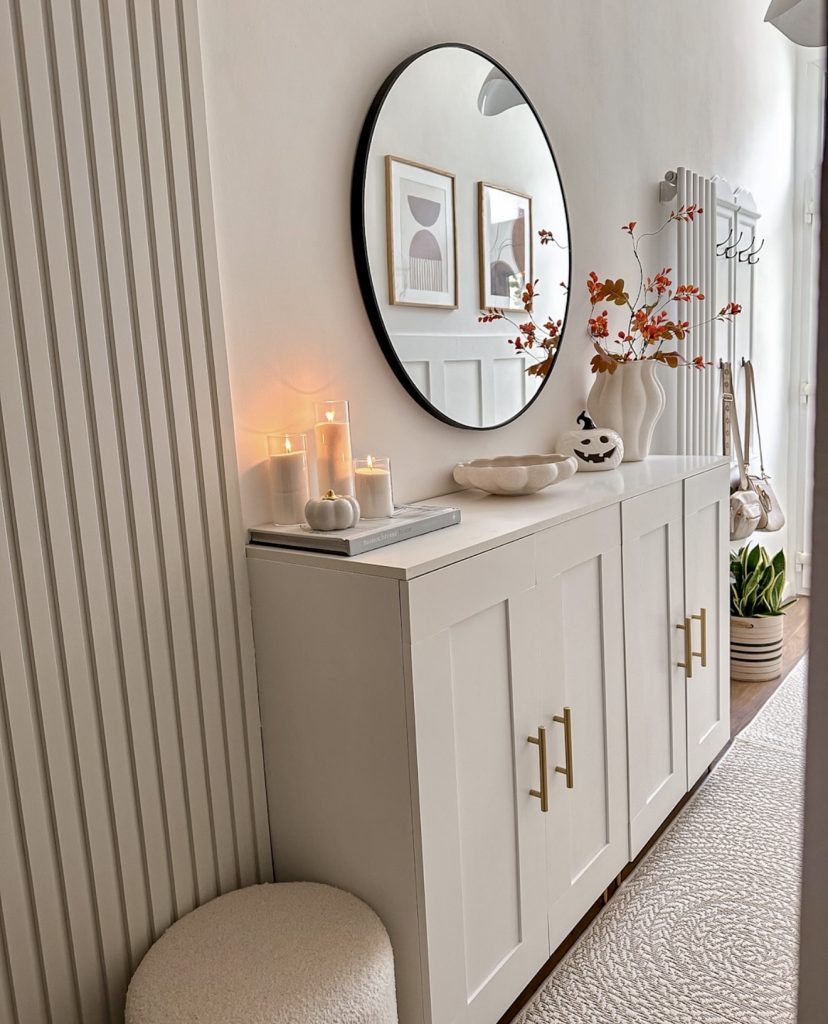 Warm light, soft neutral tones, and subtle Halloween accents turn this hallway into a charming seasonal moment that feels both stylish and attainable. The round mirror over the shaker-style cabinet instantly opens up a small narrow hallway, while the sculptural vase and autumn branches add a gentle pop of color without overwhelming the space. Gold hardware and candles elevate the mood, creating a cozy glow that’s perfect for fall transitions. This hallway decor is a wonderful example of how renters and homeowners alike can embrace decor that celebrates the season without sacrificing a clean, modern aesthetic. It’s a look that blends the simplicity of Ikea inspiration with the refined touch often seen on home décor blogs like Studio McGee.