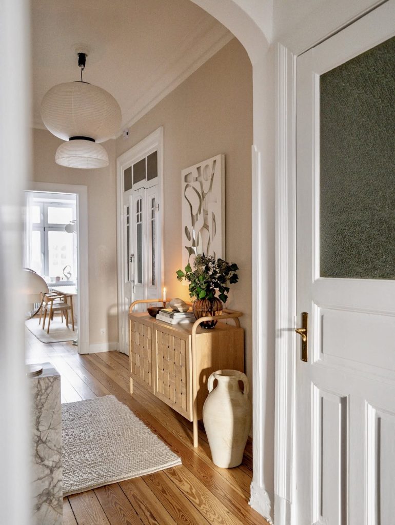 Here, soft light and earthy textures bring soul to an older home layout, proving that a long, narrow corridor can feel inviting rather than restrictive. The woven-front console adds dimension while offering practical storage, and its curved edges echo the organic trend dominating modern decor forecasts for 2026. Thoughtful styling—like stacked books, warm candlelight, and a sculptural vase—creates a lived-in warmth that complements the architectural character of a 1930s or Victorian interior. The palette leans beautifully neutral, but with enough depth to keep the space from feeling flat. It’s a reminder that hallways aren’t just transitional—they can be grounding, personal extensions of a home’s design story.