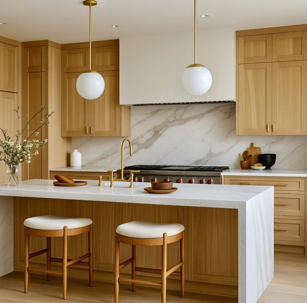 The inspiration in this space is that of subtle minimalist design with light wood cabinetry joined with dramatic marble textures to create something that symbolically conveys the calmness that is trending within 2026 design. The sculptural black light fixture adds to the modernity of it all with subtle nods to artistry that was seen in mid-century design without delving too deep into the past. The minimalist drawers and appliances are perfect for those who want design ideas that are free from clutter. The marble look that has been infused in the island combines soft luxury with something that offers functionality.