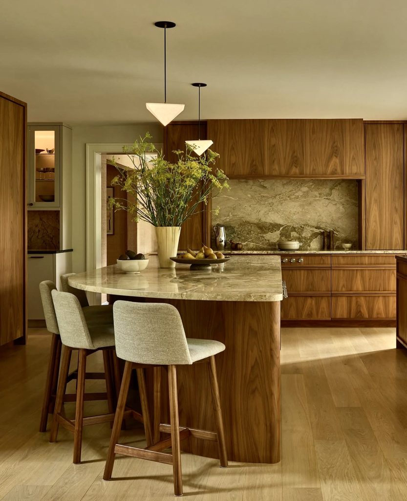 The environment here is perfectly integrated with the luxury that demands to be captured within current 2026 designs, with emphasis on the use of walnut that provides luxury with dramatic textures that are perfectly ideal to capture within current 2026 demands. The curved island provides added softness to the architectural features with an inviting area to congregate and still reflect clean modern lines. Sculptural pendant lights provide upscale illumination to reflect subtle mid-century decor that perfectly blends with upscale textures. The brown decor provides much-needed grounding with upscale appeal that perfectly addresses current upscale design trends favoring more natural textures over bright colors. Homeowners seeking inspiration to design an upscale yet friendly-appearing kitchen decor find this space greatly inspiring.