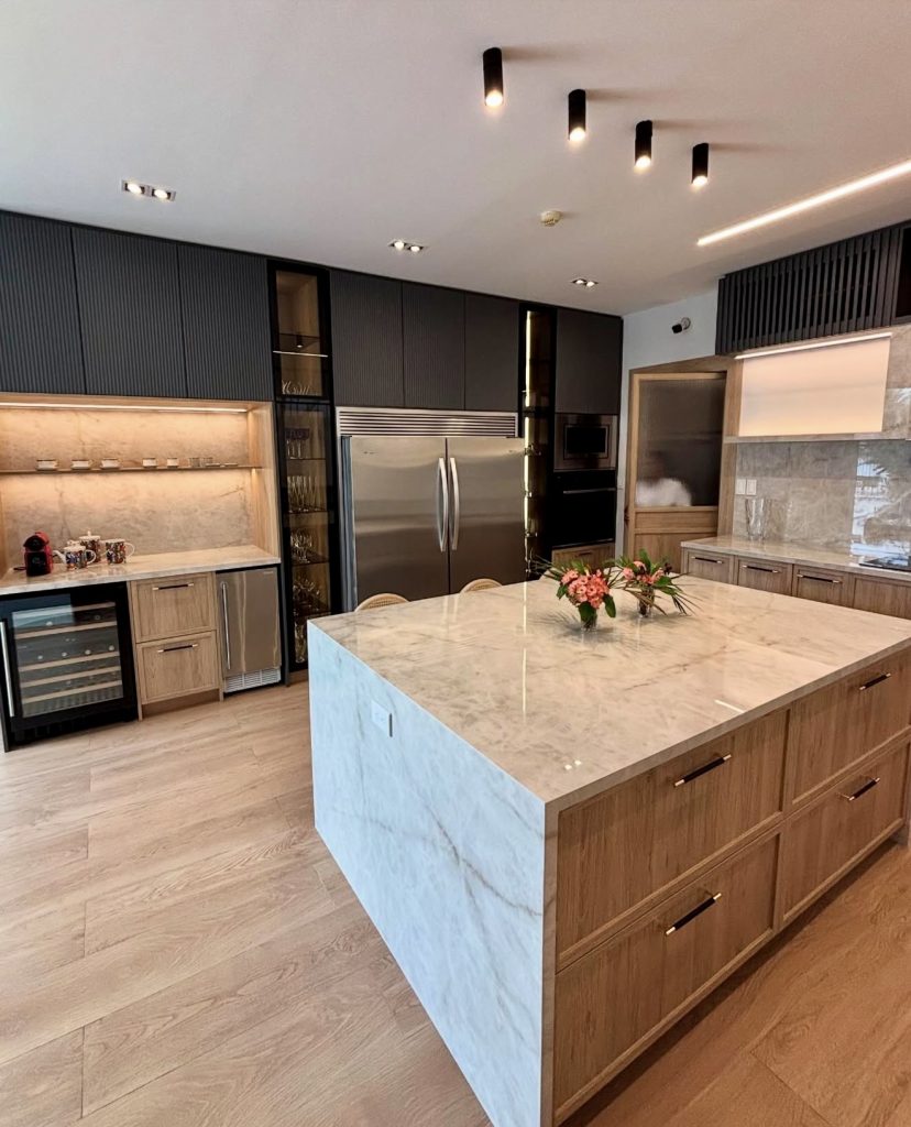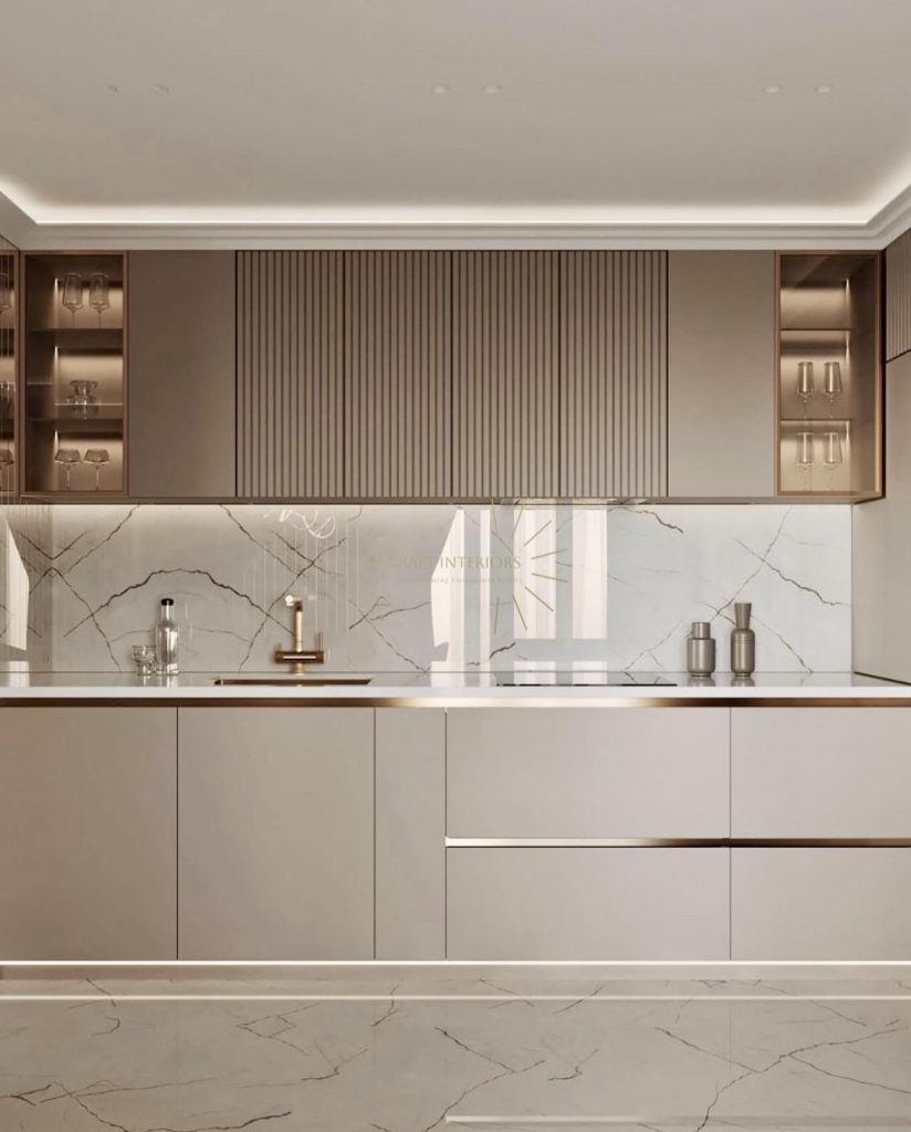 This elegant design merges smooth cabinetry with striking bronze details, creating a polished aesthetic that fits seamlessly into high-end luxury 2026 interiors. The marble surfaces add a touch of timeless sophistication, offering both durability and visual depth. Integrated lighting and glass inserts elevate the cabinetry, making the kitchen feel bright, modern, and thoughtfully crafted. The muted color palette reinforces the sense of calm luxury, ideal for homeowners seeking ideas that feel both simple and indulgent. It’s a beautifully composed space that showcases how minimalism and richness can coexist effortlessly.