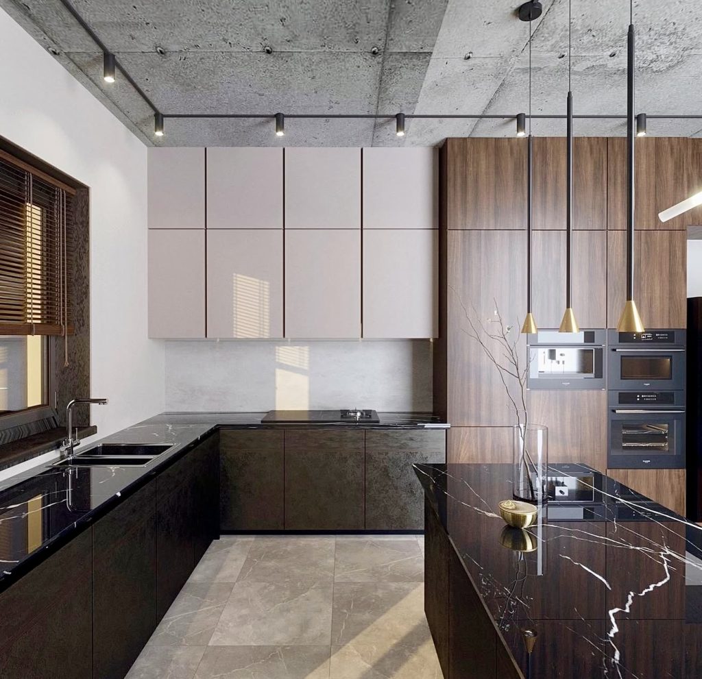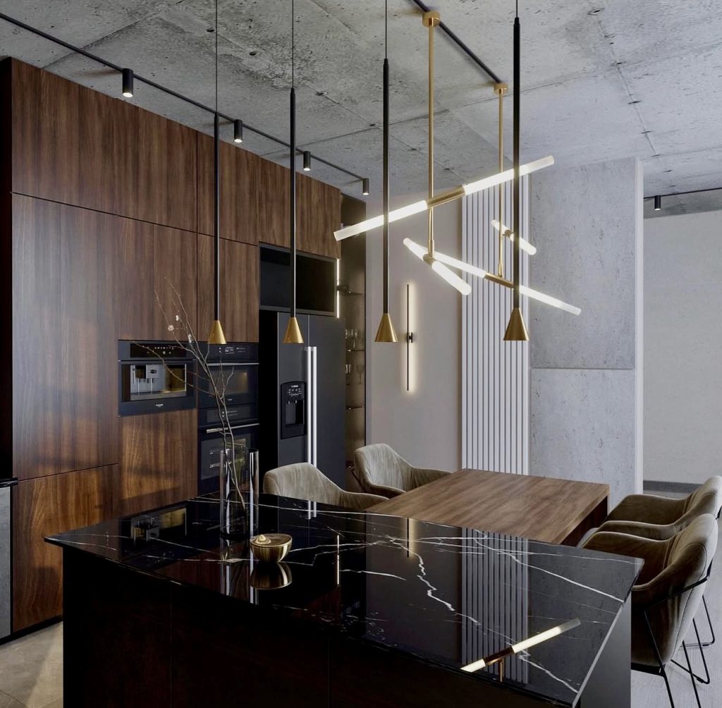 This kitchen is ideal for those who want to go all out with modern luxury designs featuring dark wood cabinetry contrasted with striking black marble countertops that inspire a deep sense of drama. The sculptural gold-toned lighting fixtures are perfectly integrated with luxury 2026 design elements in that they portray an intimidating sense of modern futurism. The concrete textures and smooth surfaces are ideal since they are reflective of refined industrial design, giving resident owners great ideas to create dramatic interiors in luxury settings. The dining area is perfectly integrated with the kitchen and shows just how popular open-space designs are going to be in 2026.